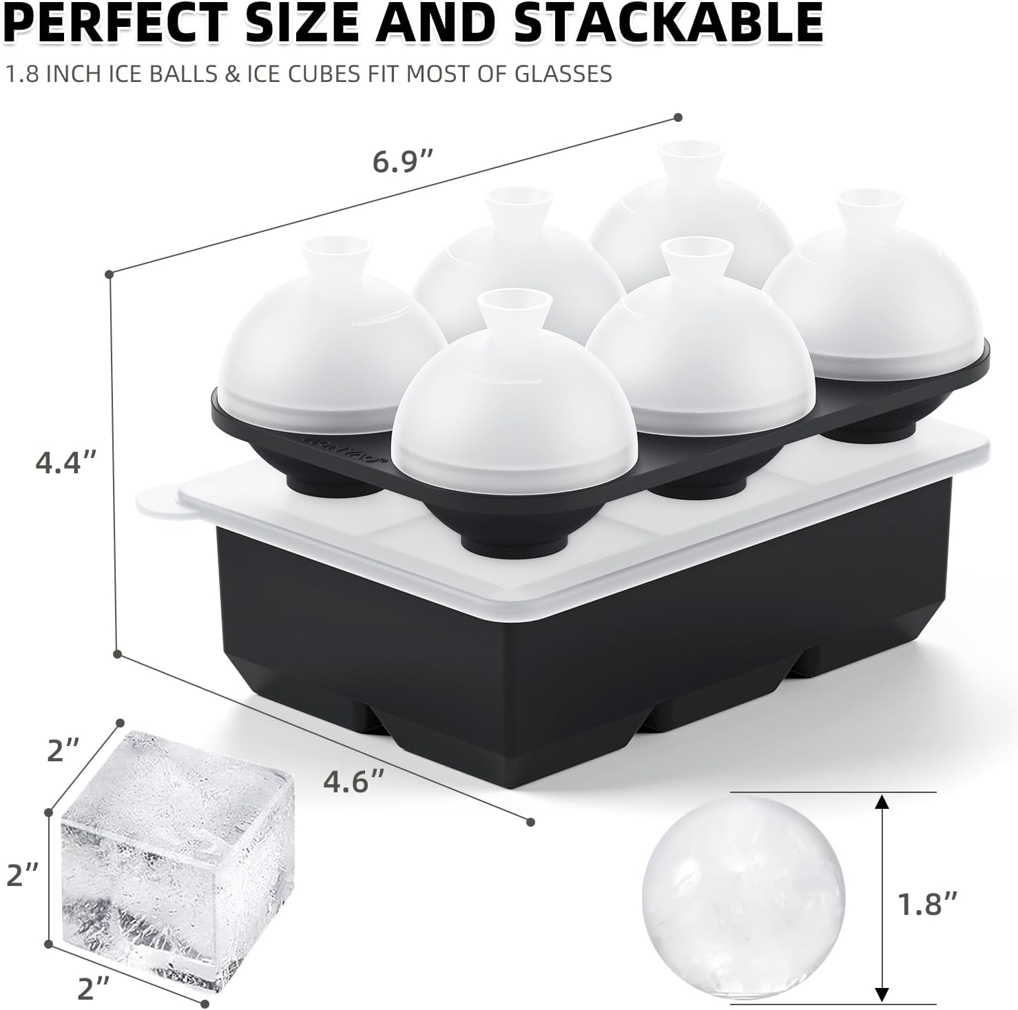 - Set of 2 Ice Mold Trays - Including 6 round ice balls of 1.8 inch and 6 square ice cubes of 2 inch. With easy to fill and easy to release design, making ice balls or ice cubes are not a tough jobs any more.