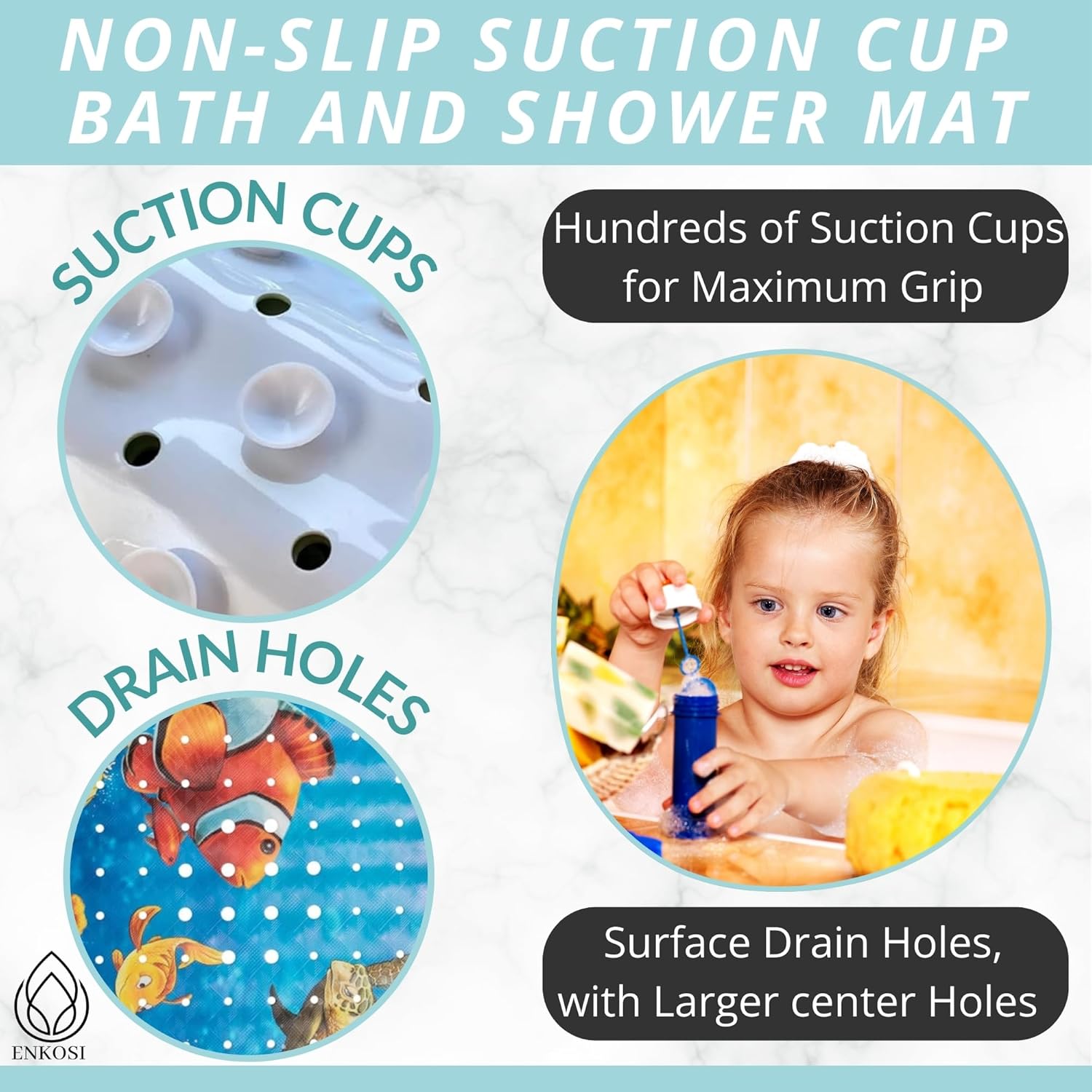 - ENKOSI BATHROOM ACCESSORIES Comfortable, durable, and made to last of safe PVC material, ensures safe shower or bath time time for yourself, your kids, and elderly parents or grandparents. PLEASE NOTE this bath mat and shower mat is suitable for smooth, non-textured surfaces only