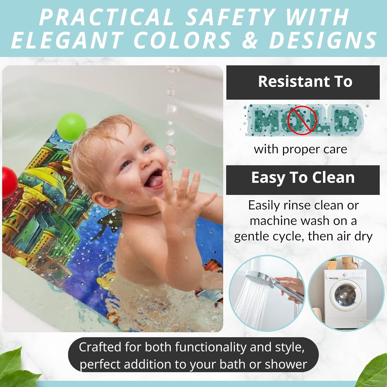 - EASY TO CLEAN Crafted from durable, easy-to-clean, and safe materials, this bath mat simplifies maintenance. Rinse it in the shower or tub, or toss it in the washing machine on the cold wash cycle and air dry for a quick and convenient clean.