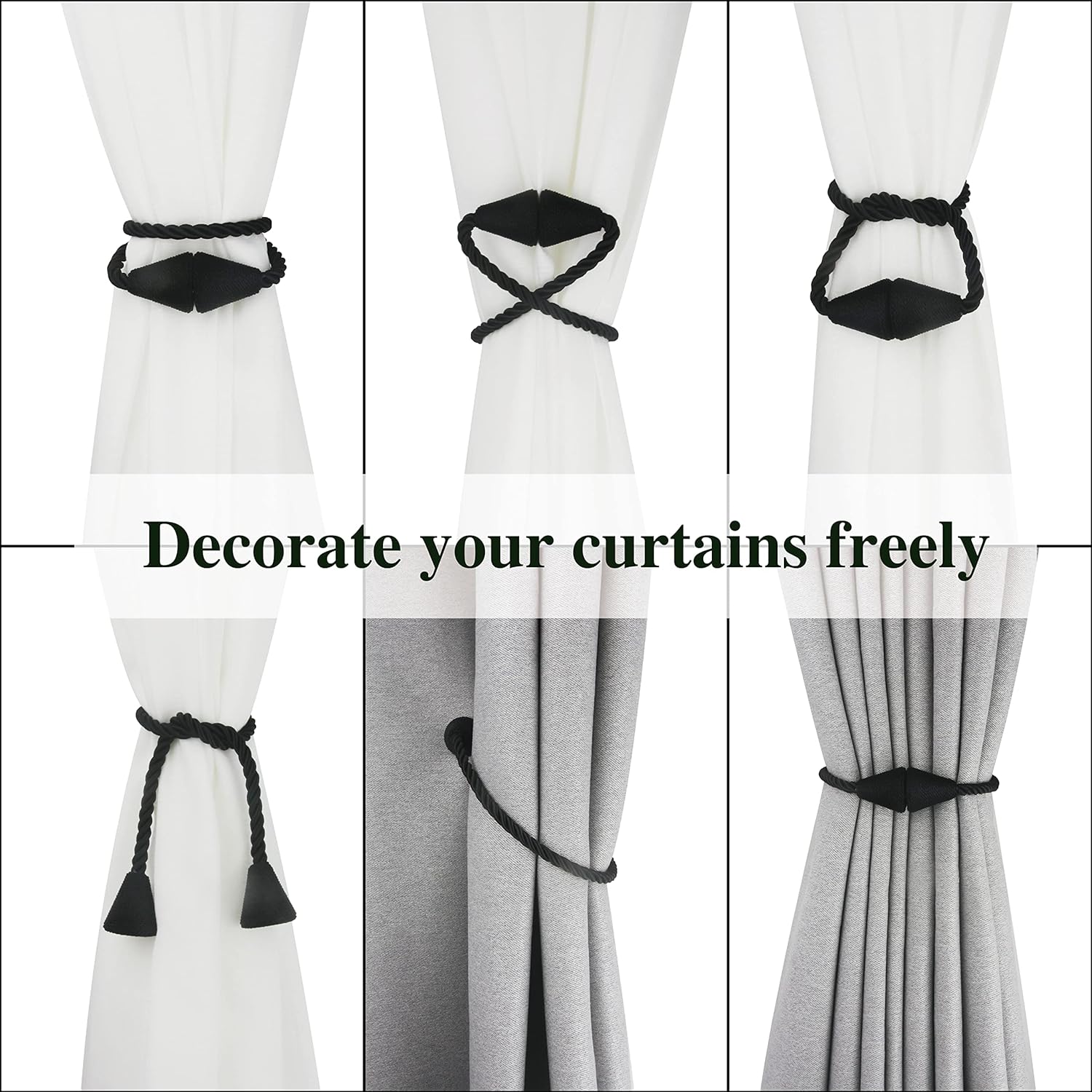 4 Pack Magnetic Curtain Tiebacks Rope Modern Handmade Curtain Tie Backs Decorative Drapes Weave Holdbacks for Window Décor, Black