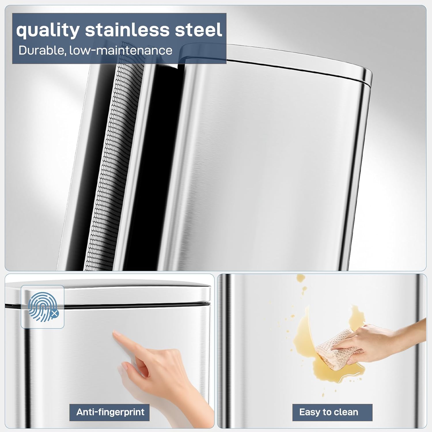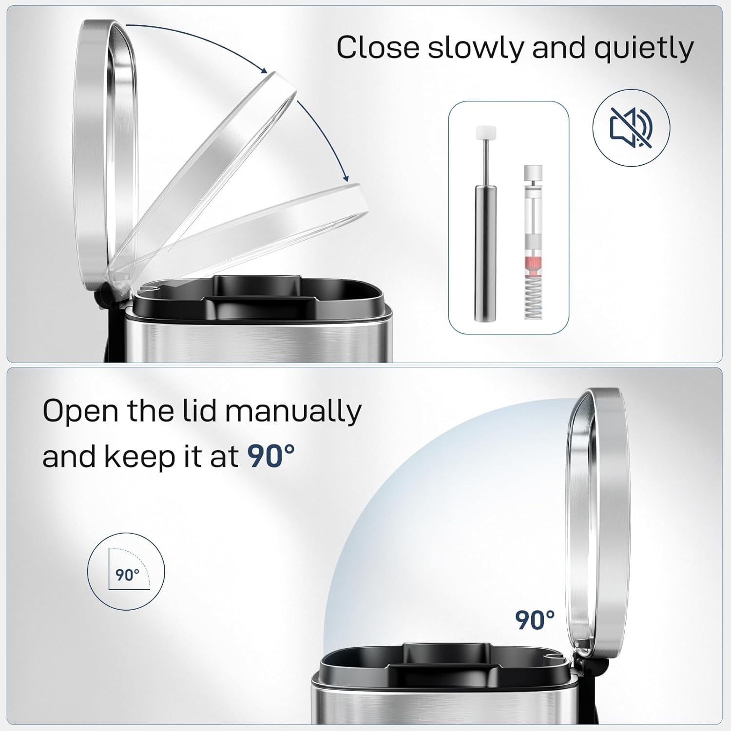 - 【WON'T DISTURB YOU】Using ABS hydraulic deceleration technology, the trash can lid can be slowly and gently closed when the pedal is released, without making a lot of noise, and it will not disturb your family when disposing of garbage.