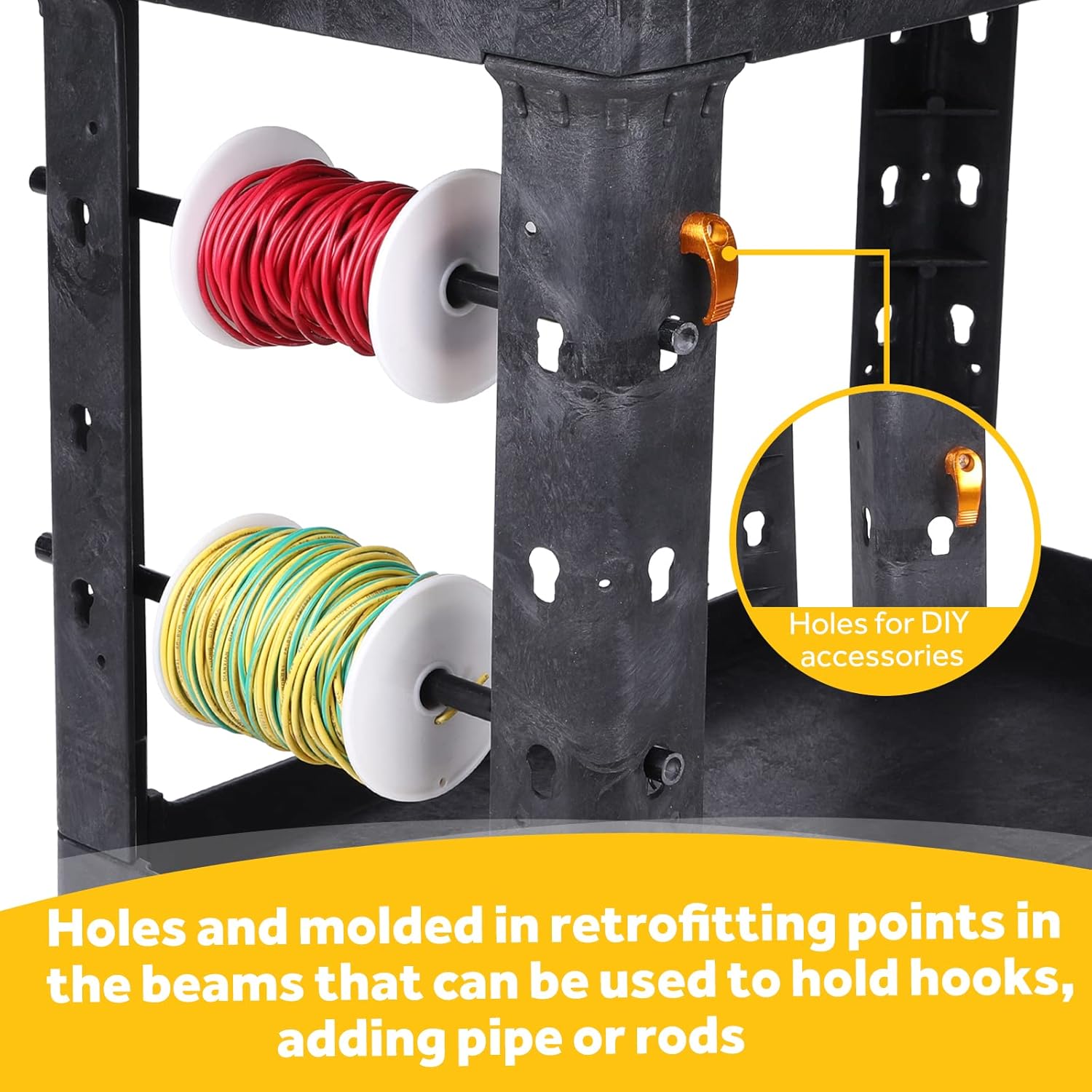- 🔆 ERGONOMIC HANDLE AND CUSTOMIZABLE FITTINGS: Our service cart ergonomic push handle is molded into top shelf with a built-in storage compartment, which provides optimum hand placement and pushing height to improve control & worker safety. Molded In Retrofitting Points in beams allow you to add pipe or rods to hold wire spools and other roll type goods.