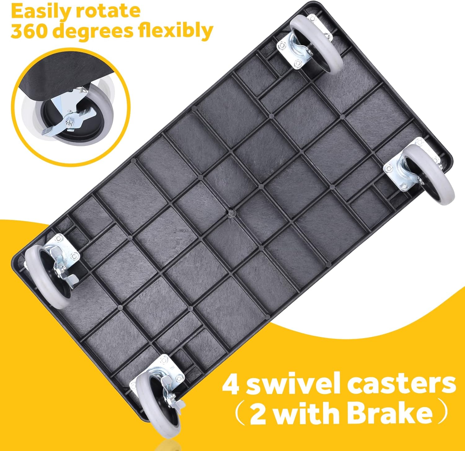 - 🔆 EASY MANEUVER & LOCKING BRAKES: Equipped with four swivel casters, two of which are lockable, this cart ensures effortless navigation even in confined spaces. The 5-inch wheels are crafted from industrial-strength polypropylene for smoothness and durability. Moreover, an exterior wrap of Thermo-Plastic-Rubber not only absorbs shock and reduces noise but also prevents floor scratches and carpet snags. Experience 360-degree flexibility and labor-saving transport.
