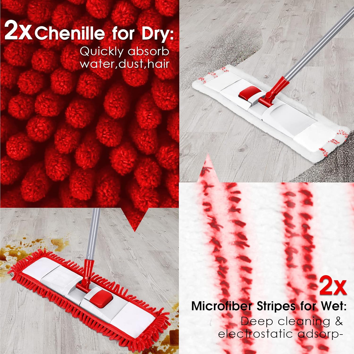 - Two Types of Pads: The floor mop comes with two kinds of mop pads, which are made of microfiber, chenille and nylon. And 4 replacement mop pads are reusable and washable. The mop pads can save your money. We get a dirt removal scrubber to help you clean the stains on the mop pads.