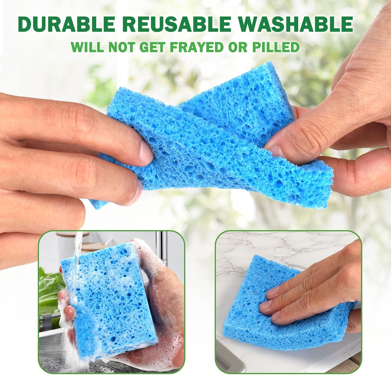 - [Strong Absorbent & Rich Foam]The ECO Cellulose sponges for washing dishes is 18x super absorbent sponges. The dehydrated sponges will expand to 18x size after absorbing water. With dishwashing liquid, it can produce rich foam easily by squeezing gently, saving detergent and getting perfect cleaning effect.