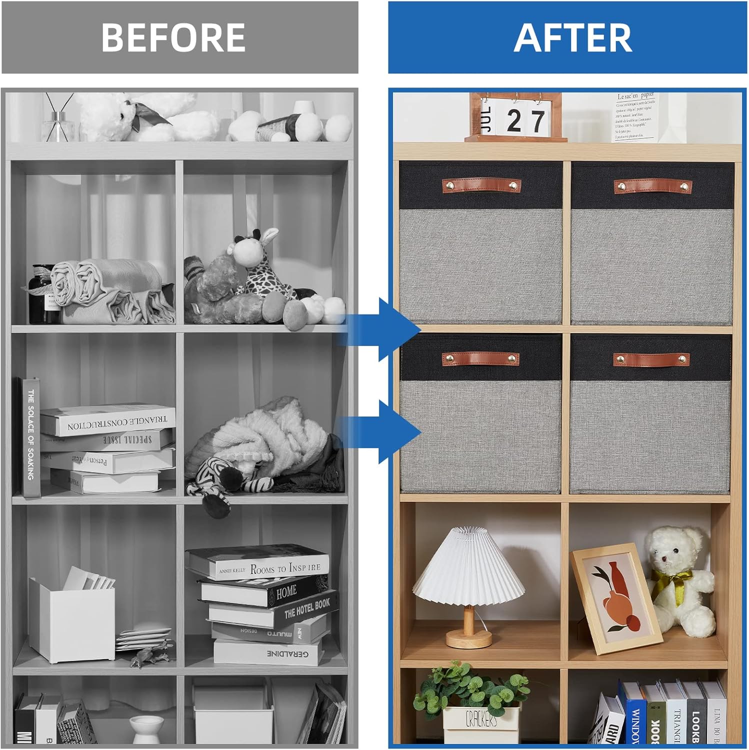 Temary 13 x 13 Storage Cubes Foldable Storage Cubes 4 Pack Canvas Storage Bin for Home, Square Storage Baskets with Leather Handles (Black&Grey)