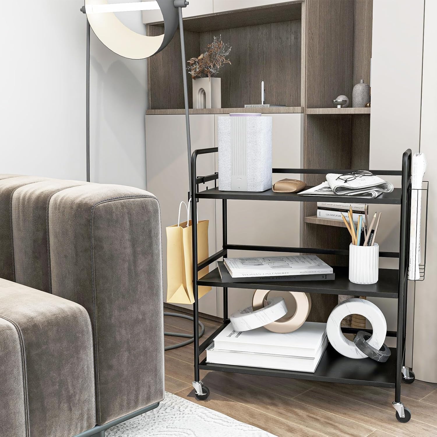 - 【Easy To Move】This Black Rolling Cart Is Easy To Move Around With Its Four Wheels (two Of Which Lock) And Rounded Handle.