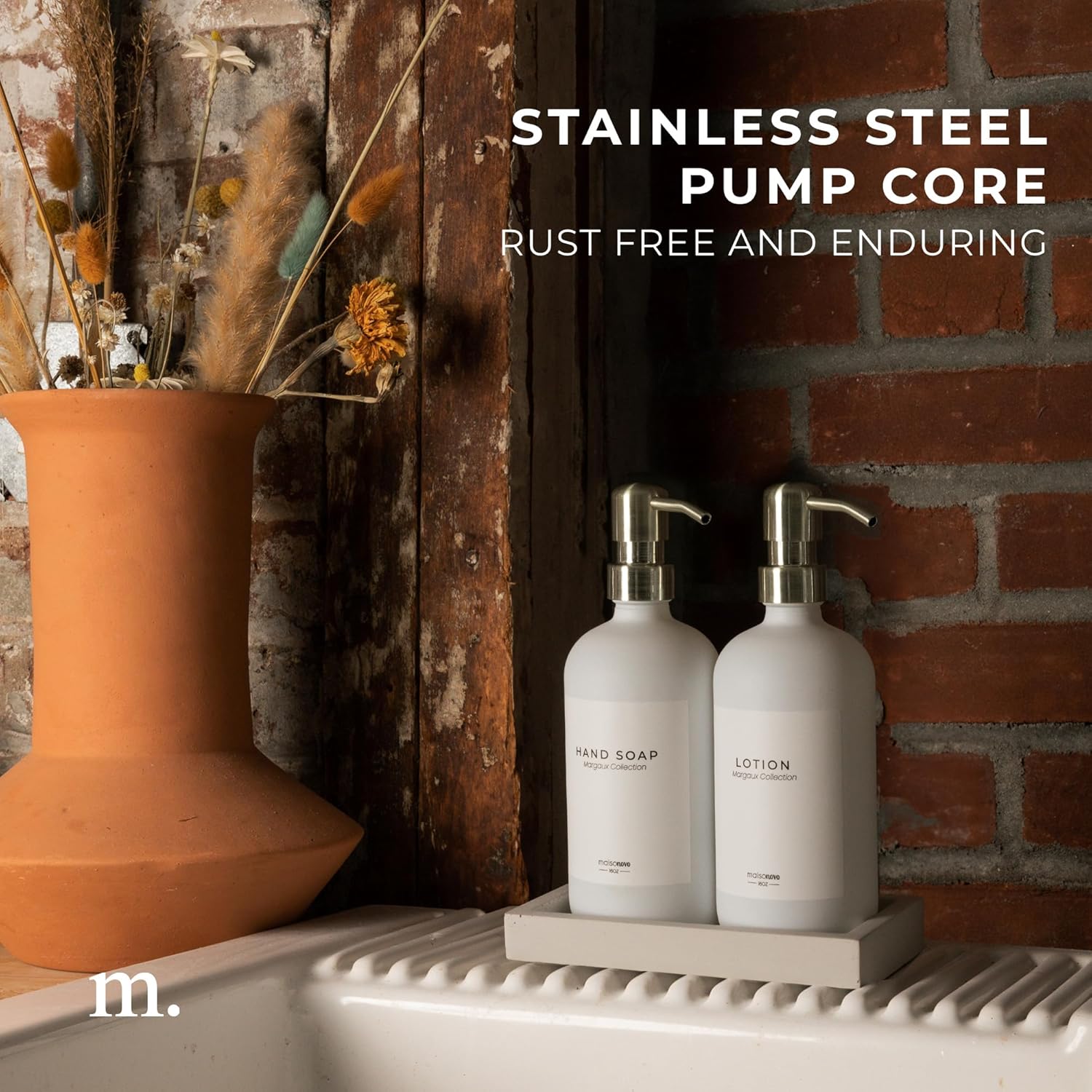 - Quality Materials: Designed in the USA and made with ISO14001 environmental standard these dispensers are crafted from premium quality glass and featuring a robust concrete tray, these soap dispensers are built to last. The waterproof labels are designed to withstand daily use, ensuring that your set remains both functional and beautiful over time.