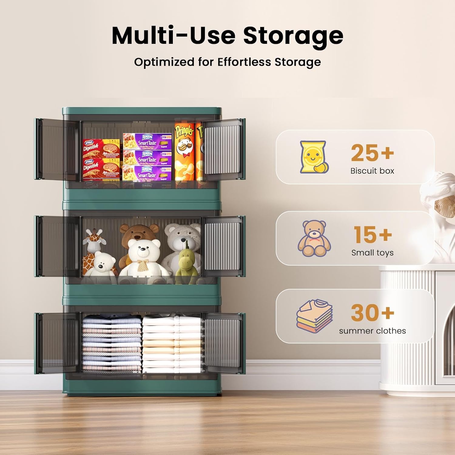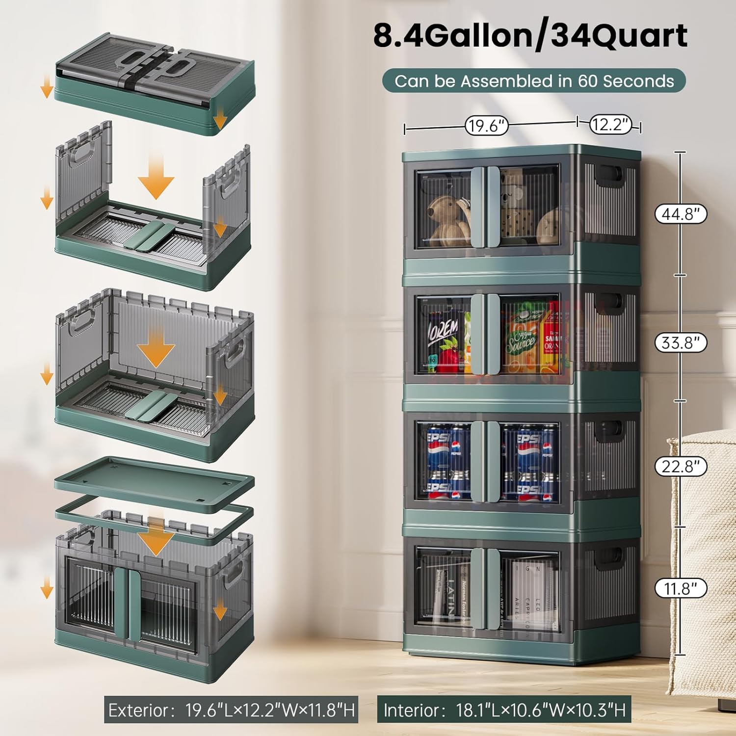 8.4Gal Collapsible Storage Bins with Lids & Wheels - 3 Pack Stackable with Doors, Heavy-Duty Plastic Containers for Home/Office, Green