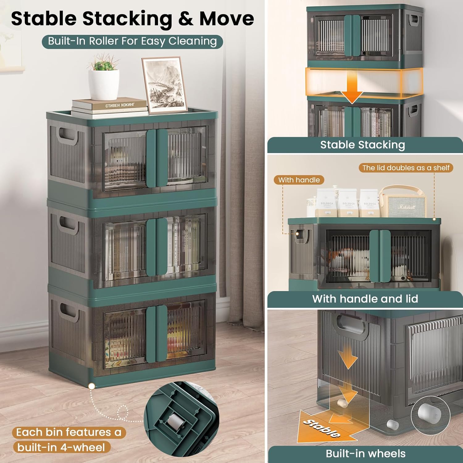 8.4Gal Collapsible Storage Bins with Lids & Wheels - 1 Pack Stackable with Doors, Heavy-Duty Plastic Containers for Home/Office, Green