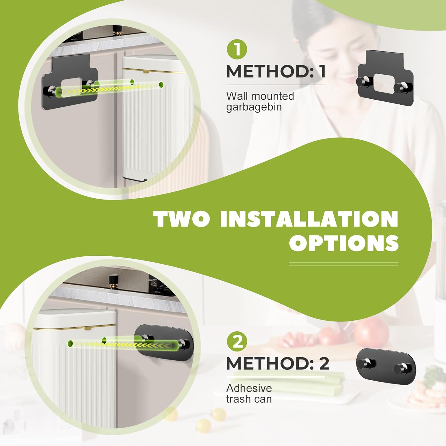 - 【Versatile and Space-Saving】Our hanging trash can features two lid-opening options and two hooks for flexible installation. Whether wall-mounted or hung on cabinet doors (suitable for doors less than 1.15 inches thick), it conveniently fits under sinks, under cabinets, cupboards, kitchen walls, and bathroom walls. Saving countertop space and making cleaning a breeze.