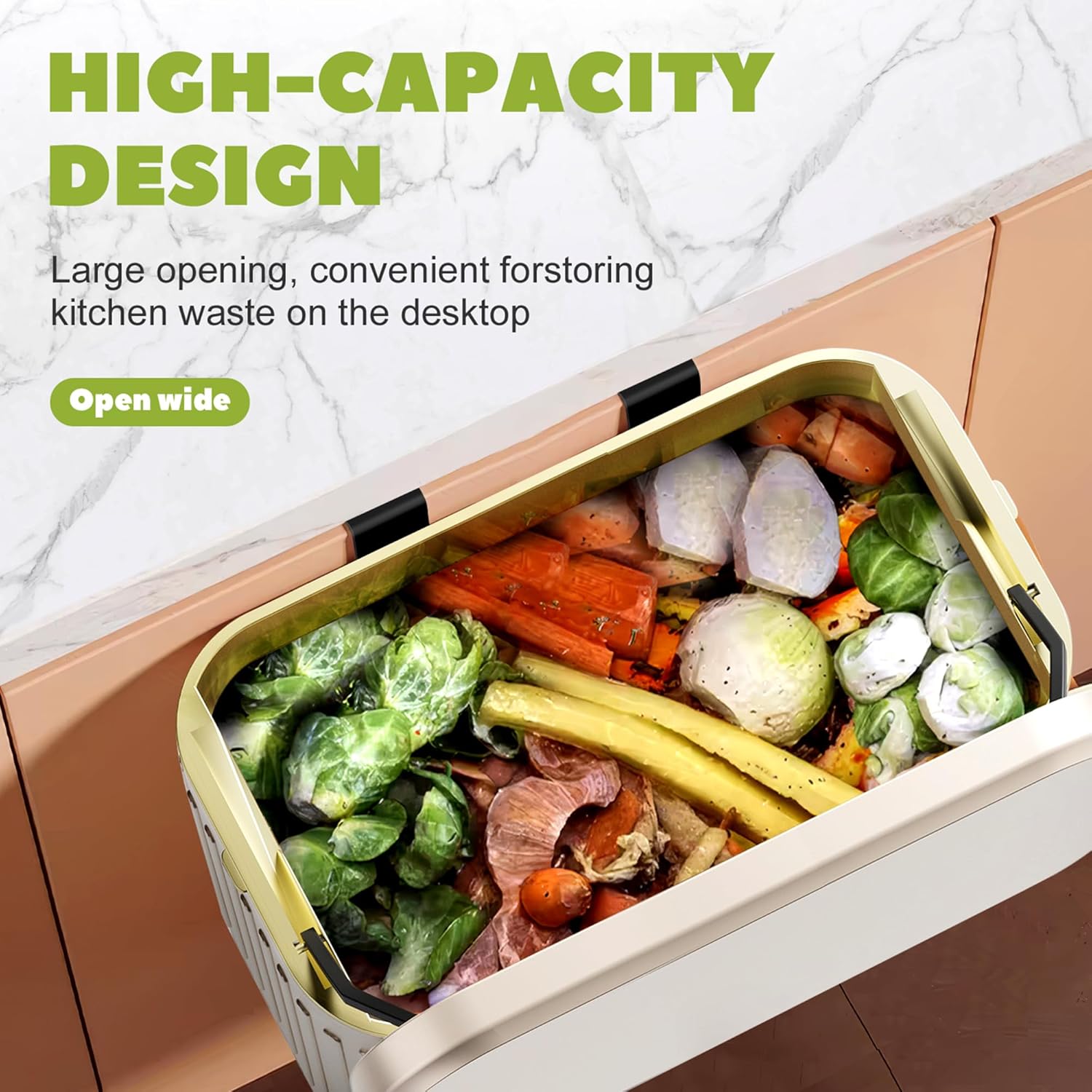 - 【Removable Inner Bucket for Convenience】Composed of inner and outer buckets, the small kitchen trash can offers exceptional convenience for loading and unloading waste. The retention holes on the inner compost bin kitchen prevent garbage bags from sliding down, ensuring a neat and tidy appearance on your countertop.