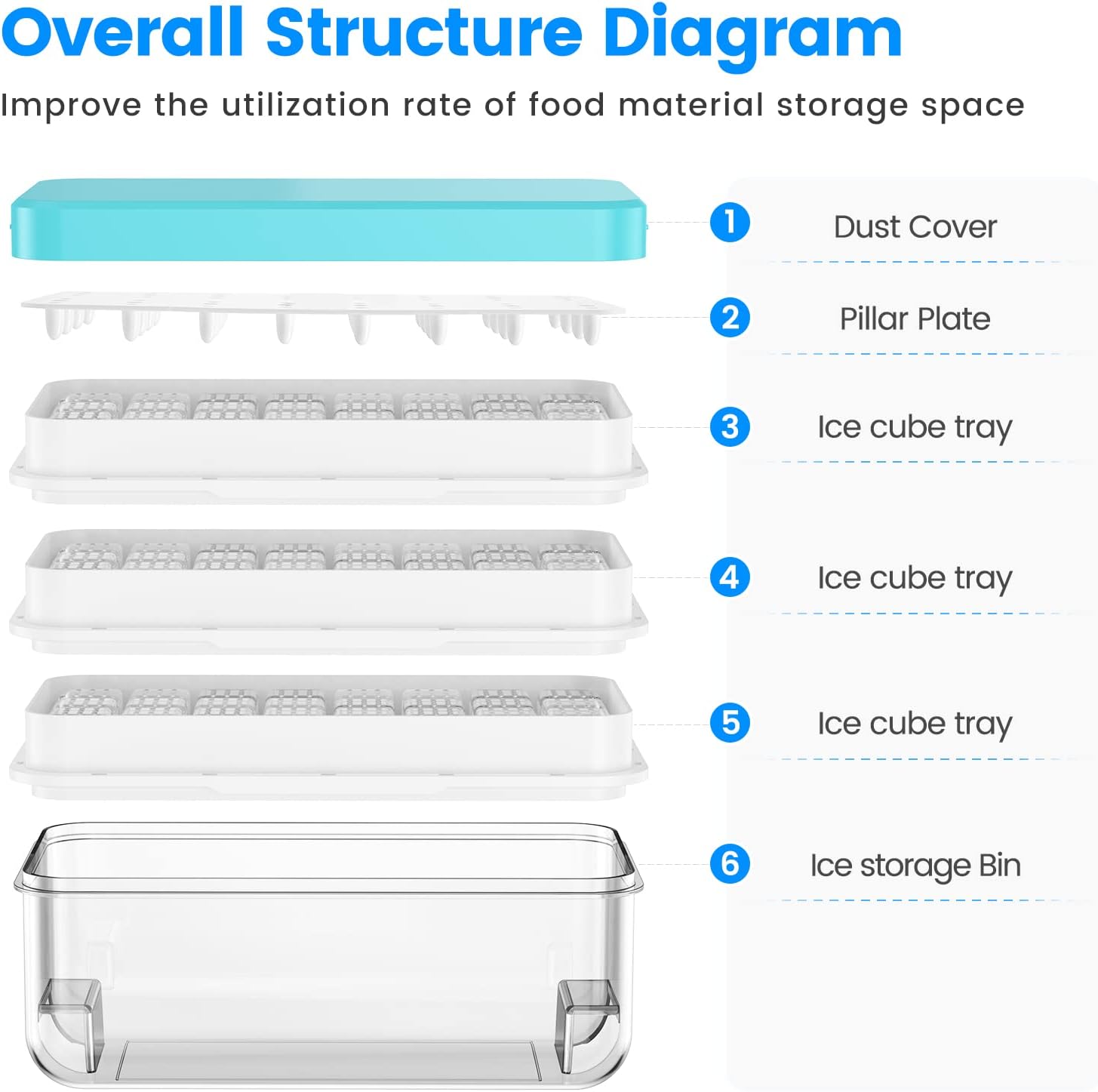 - Food Grade Material & BPA Free:This ice trays for freezer with lid and bin are made of food grade PP material, which is safe and can be frozen and used repeatedly for a long time.The ice cube tray is NOT DISHWASHER SAFE