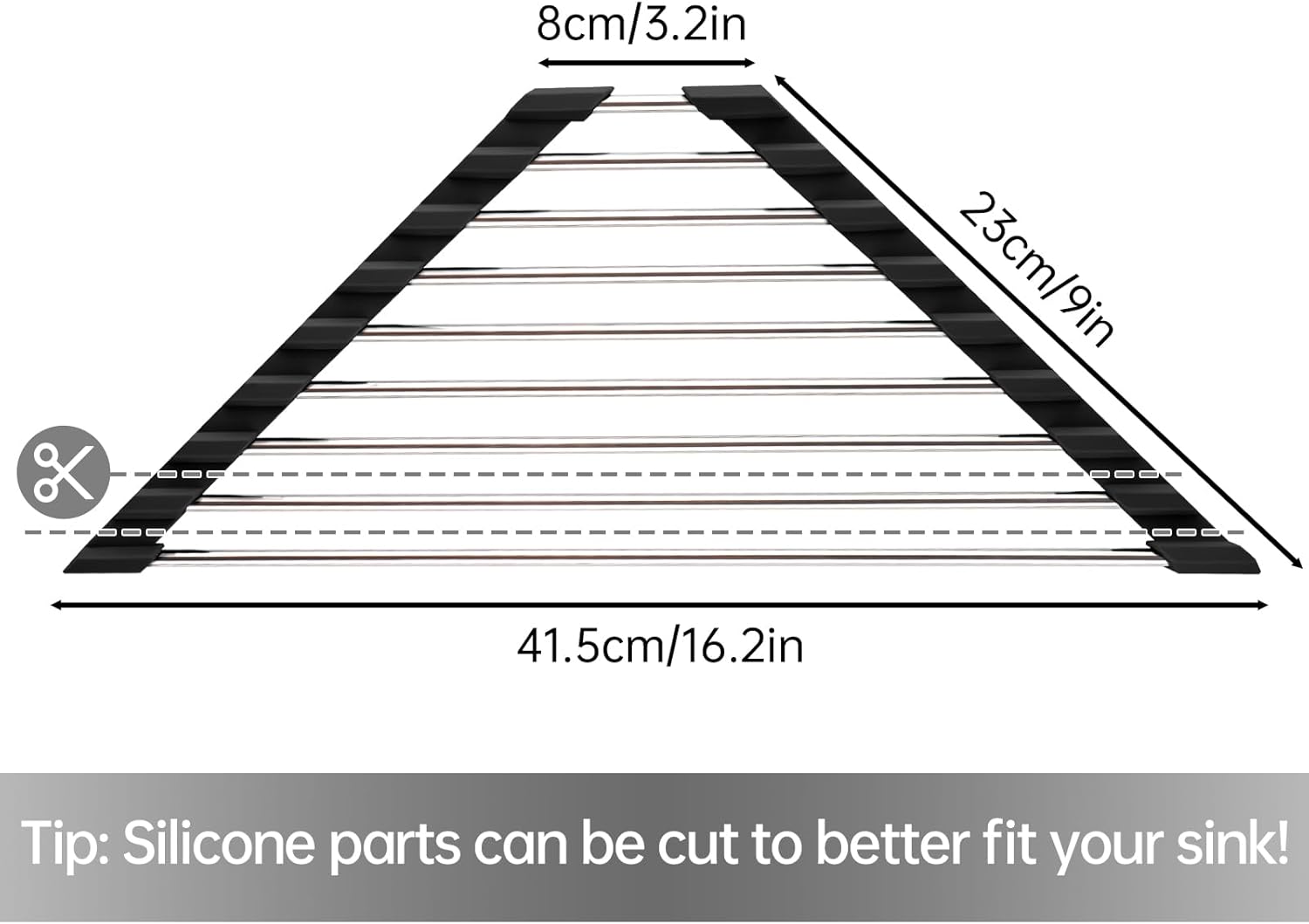 - ✔️【Customizable Size】Tailored to optimize your kitchen sink corner space with a triangular design. Too big? Simply use scissors to cut the silicone sides for a perfect fit. It's a handy tool that allows you to easily rinse and dry small items to keep your kitchen clean. Ideal for accommodating sponges, brushes, hand soap, dishes and more. Bottom Length: 16.2”, Side Length: 9”, Upper Length: 3.2”.