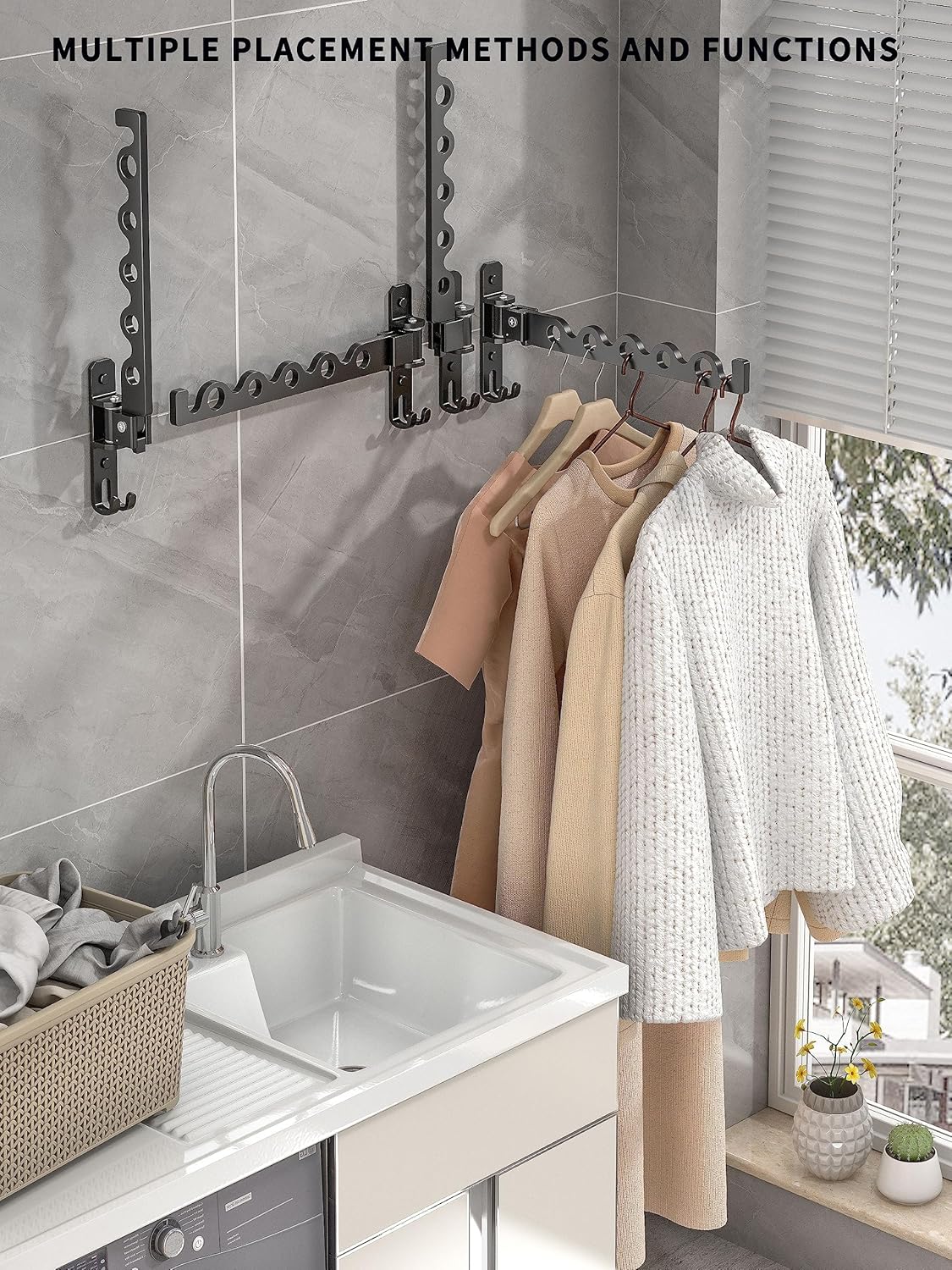 Dr.DJ Wall Hanger for Clothes, Coat Hanger Wall Mounted Matte Black Retractable Clothes Drying Organizer Rack Garment Hooks Aluminium Folding Indoor Wall Space Saver (2 Racks) Black