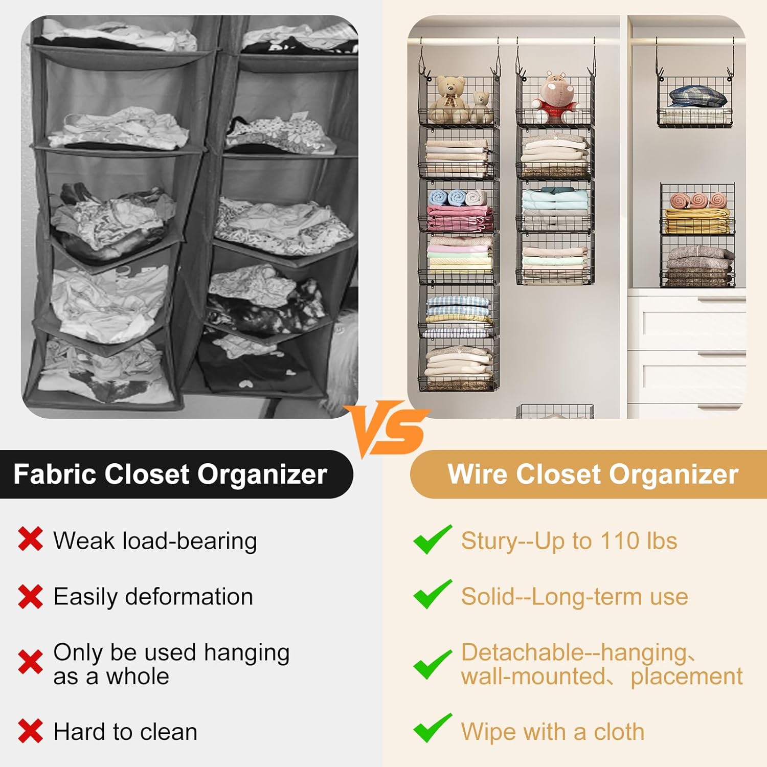 - 👔6 in 1 or Use Alone: X-cosrack closet hanging organizer is the layered design, used alone or stacked according to your own need and idea. And you can screw all the five baskets together and hang them as a unit on the closet rod to store clothes, hats, sweaters, jeans, shirts, shoes, purses and other accessories. Also, you can hang 3 baskets on the wall, and place 2 on the shelf. You can DIY the using methods.