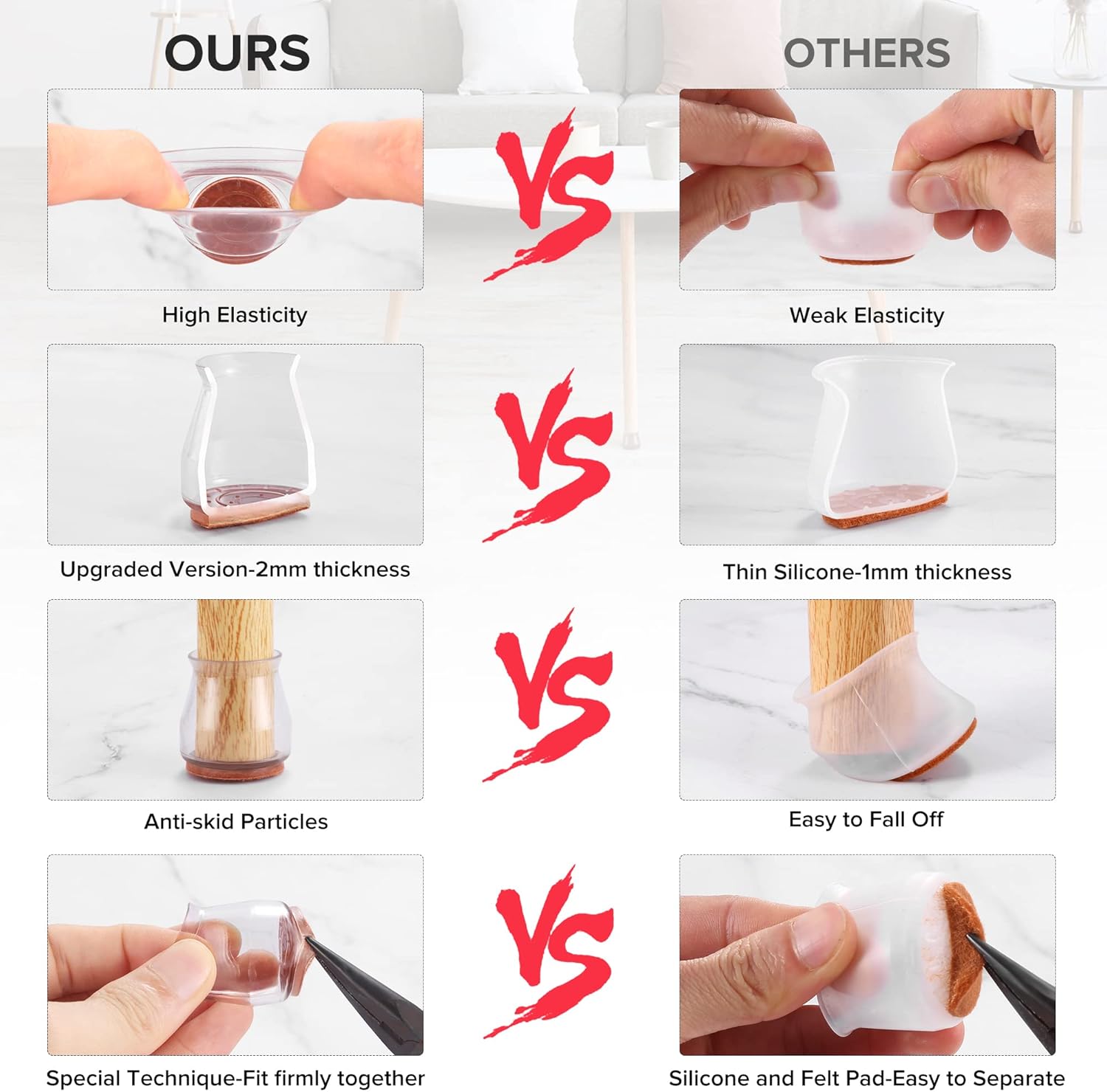 - ✅【Latest Upgrade】Compared with most of the traditional 1mm furniture pads on the market, our chair leg floor protectors are made of 2mm thick silicone, which will never be damaged, durable. The chair leg protectors will not change color when stretched. Inside of the inner sleeves are particles with anti-slip, which will firmly fix the chair and never make the covers fall off. Felt pads at the bottom make your furniture move silently and smoothly along floors without leaving marks and noise.