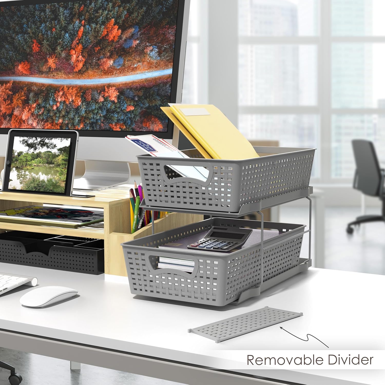 - Two drawers with dividers. Great for kitchen, bathroom and storage room organization. Gain more space in the cabinet, pantry room or even open space