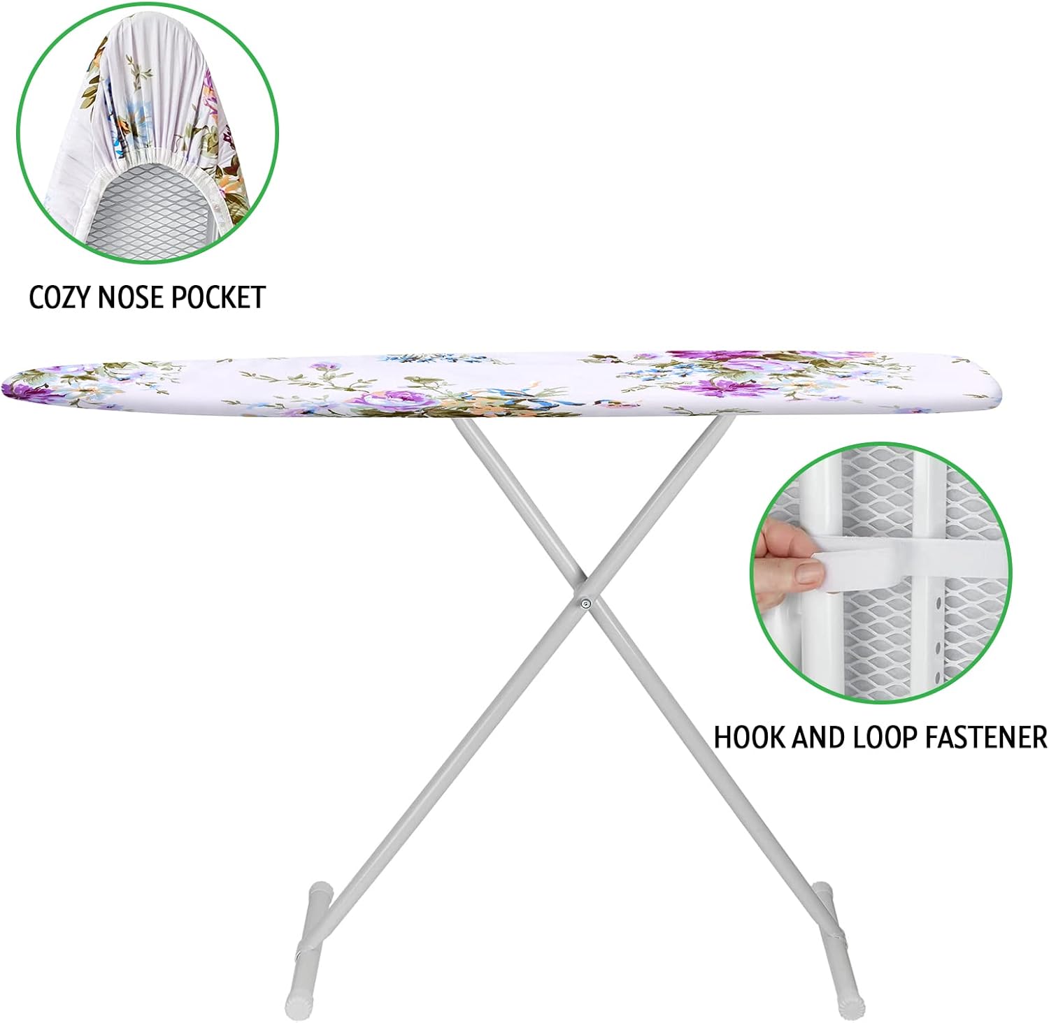 - Secure Fit: the nose pocket design with elasticized edges and hook and loop fasteners straps ensure securely non-slip fits and keep the ironing board cover in place on standard sized ironing board. No need to worry about your ironing board covers slipping.Make your ironing chores more smooth and enjoyable.