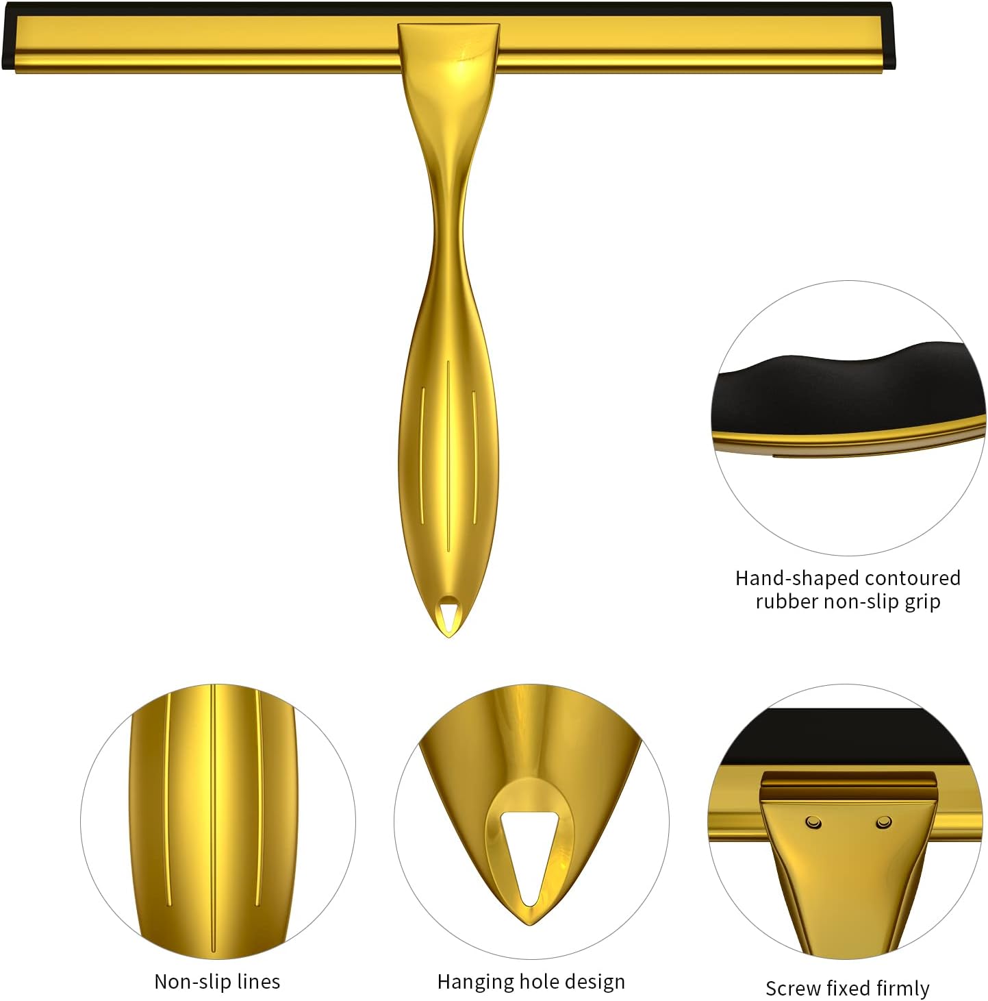- ERGONOMIC NON-SLIP HANDLE DESIGN: Considering the special damp environment in the bathroom and the handle getting slippery when your hand is wet, we made an upgrade constructive design on the original squeegee to built-in a Contoured Rubber Non-Slip Grip which will fit the fingers perfectly when grasp. Combined with the curved handle which is more ergonomic for grasp compared to the straight handle can effectively minimize the effort you use when wipe