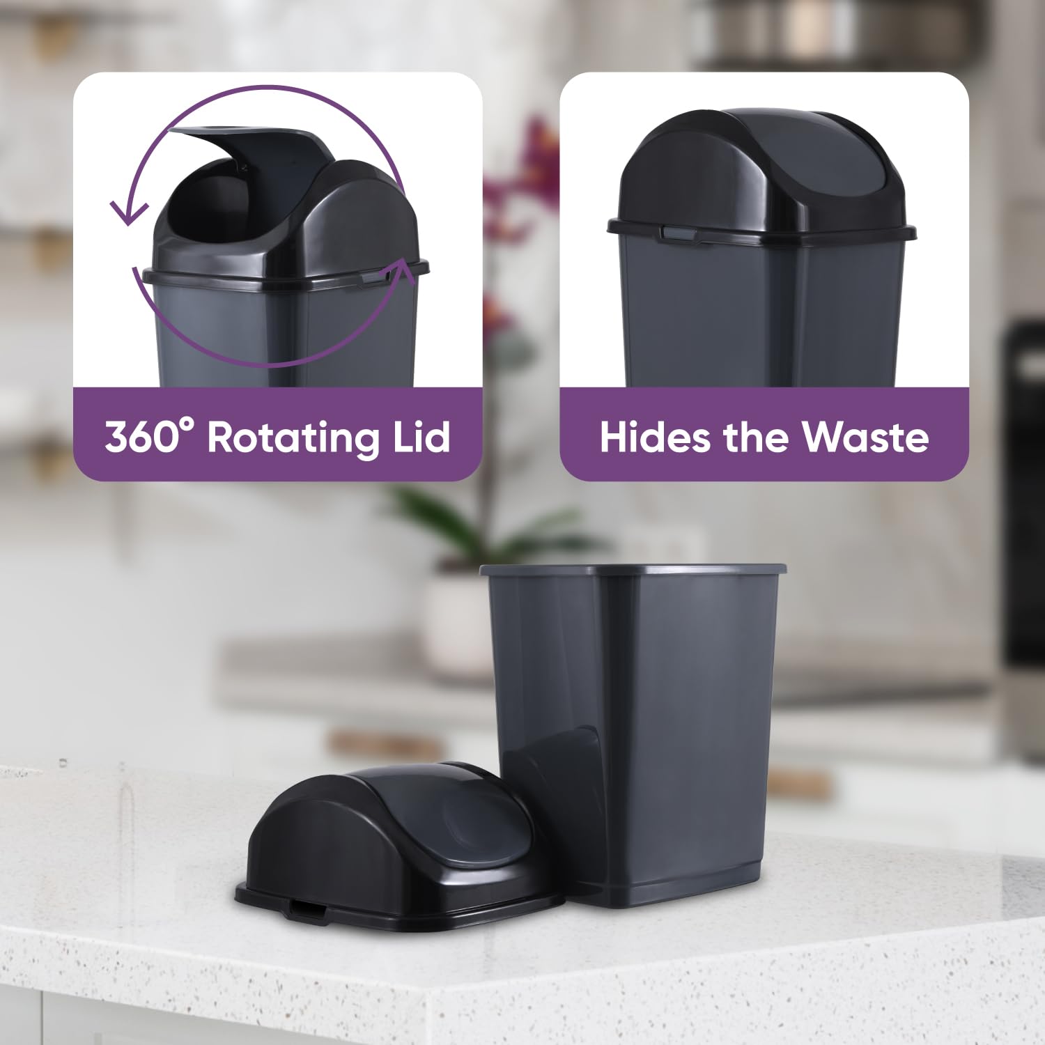 Superio Small 2.5 Gallon Plastic Trash Can with Swing Top Lid, Compact Slim Waste Bin for Under Desk, Office, Bedroom, Bathroom, Dorm Room, 10 Qt. Portable Garbage Can (Dark Grey, 2 Pack)