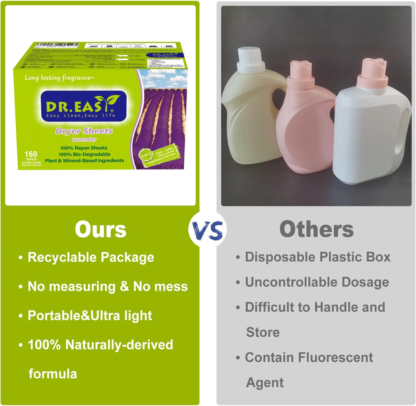 - 4 IN 1 EFFECTS: We coat our dryer sheets with effective fabric care ingredients, which will make your laundry extra soft, fresh and static-free, smooth out wrinkles and even help repel lint and pet hair. DR.EASY dryer sheet will make your laundry look and smell better without leaving any sticky residue on your hands. Plant-Based formula make it safe around kids, pets, and the planet.