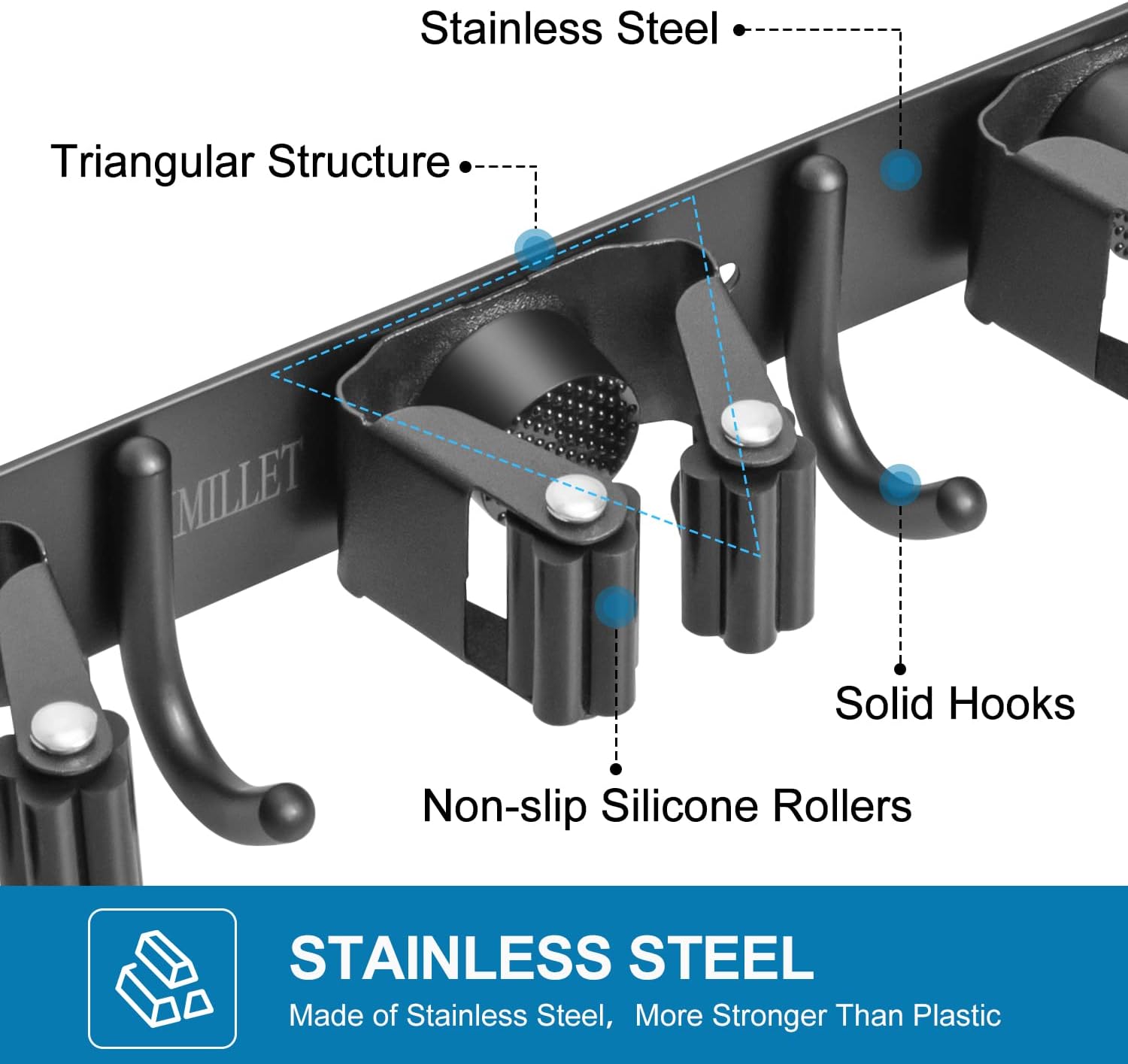 - STRONG & STURDY: Broom holder wall mount is made of stainless steel, corrosion-resistant, moisture proof and waterproof. Compared with the plastic broom hanger, it's more stronger and sturdy. And this broom organizer wall mount can hold up to 200 pounds when mounted it with the screws