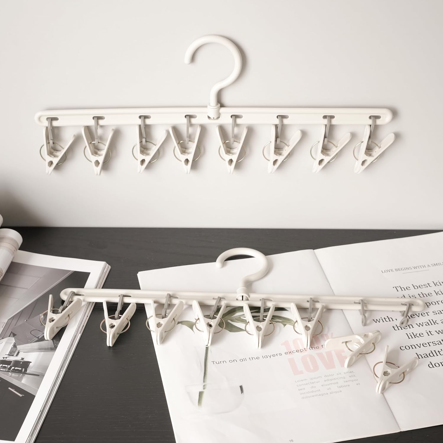 - STURDY MATERIAL & PREMIUM CLIPS:Clips drying hanger made of high quality plastic and long lasting spring, it is extremely sturdy and durable. The 8 pieces of high stretch clips hold items tightly.