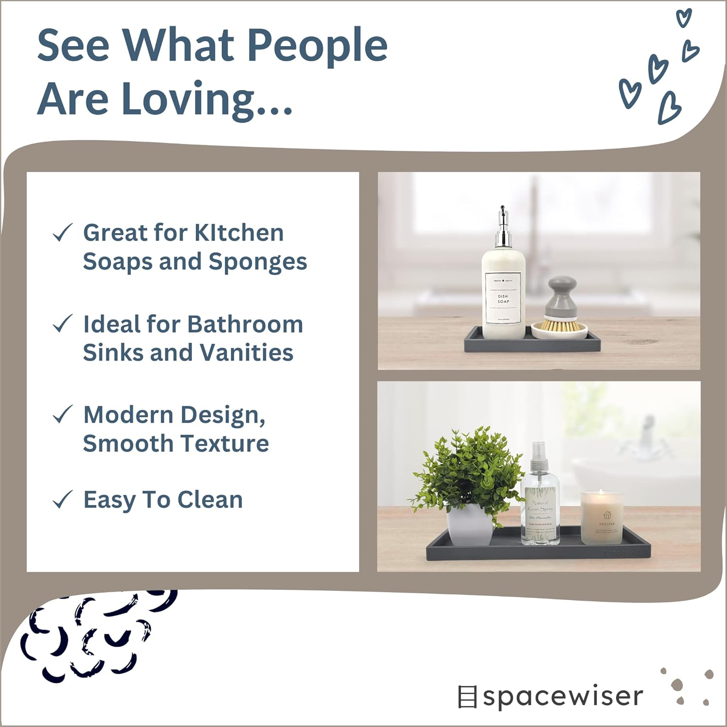 - Use Them Anywhere – Choose the endlessly useful and aesthetically pleasing trays that work anywhere. Spacewiser Original Silicone Trays work perfectly as a bathroom tray, vanity tray or kitchen sink tray. Spacewiser trays are made of premium food grade silicone, without the addition of potentially unsafe thickening and hardening agents or chemicals. They’re shatterproof, waterproof, slip-resistant, heat resistant to 425F, and dishwasher safe.