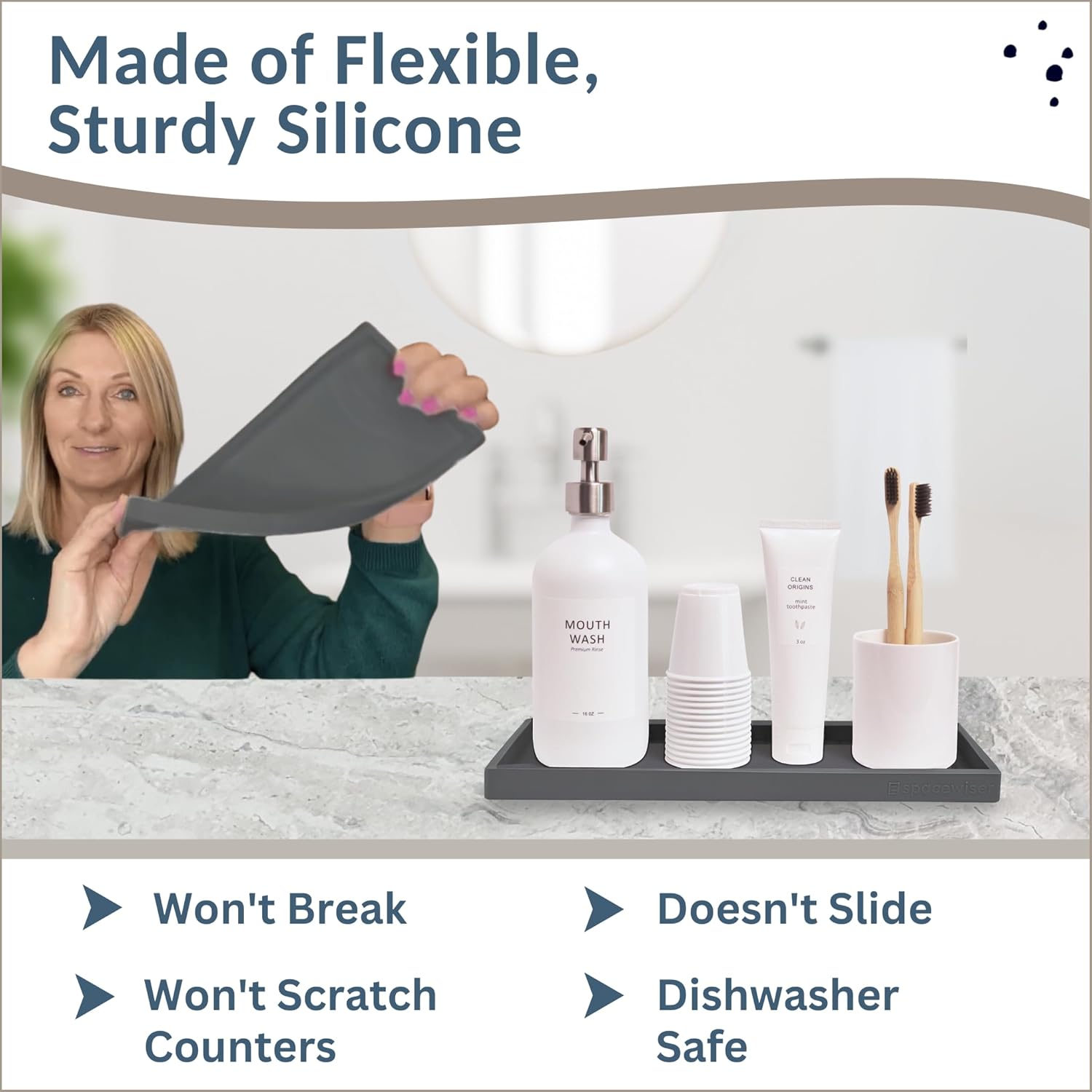 - Use It Anywhere - Choose the endlessly useful tray that works anywhere. The Spacewiser Original Silicone Tray is a perfect bathroom tray countertop accessory, bathroom sink vanity tray, or sink tray for kitchen counter. The tray is made of premium food grade silicone, without the addition of potentially unsafe thickening agents or chemicals. It’s shatterproof, waterproof, slip-resistant, heat resistant to 425F, and dishwasher safe- the perfect grey bathroom trays for counter or sink organizer.