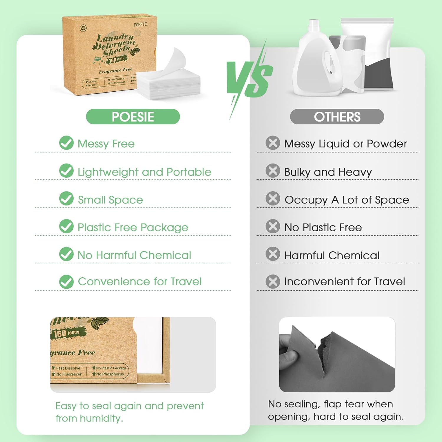 Poesie Laundry Detergent Sheets Fragrance Free Non-Plastic Precut Zero Waste 160 Count Liquidless Washing Strips for Home Dorm Travel Camping Hiking Portable