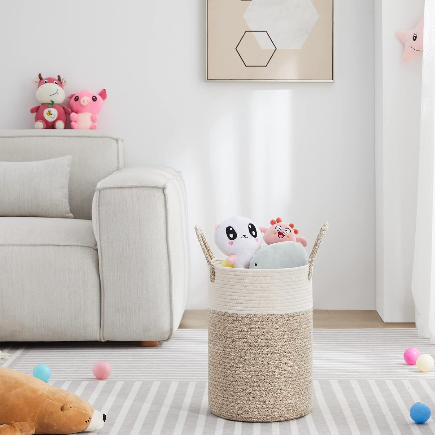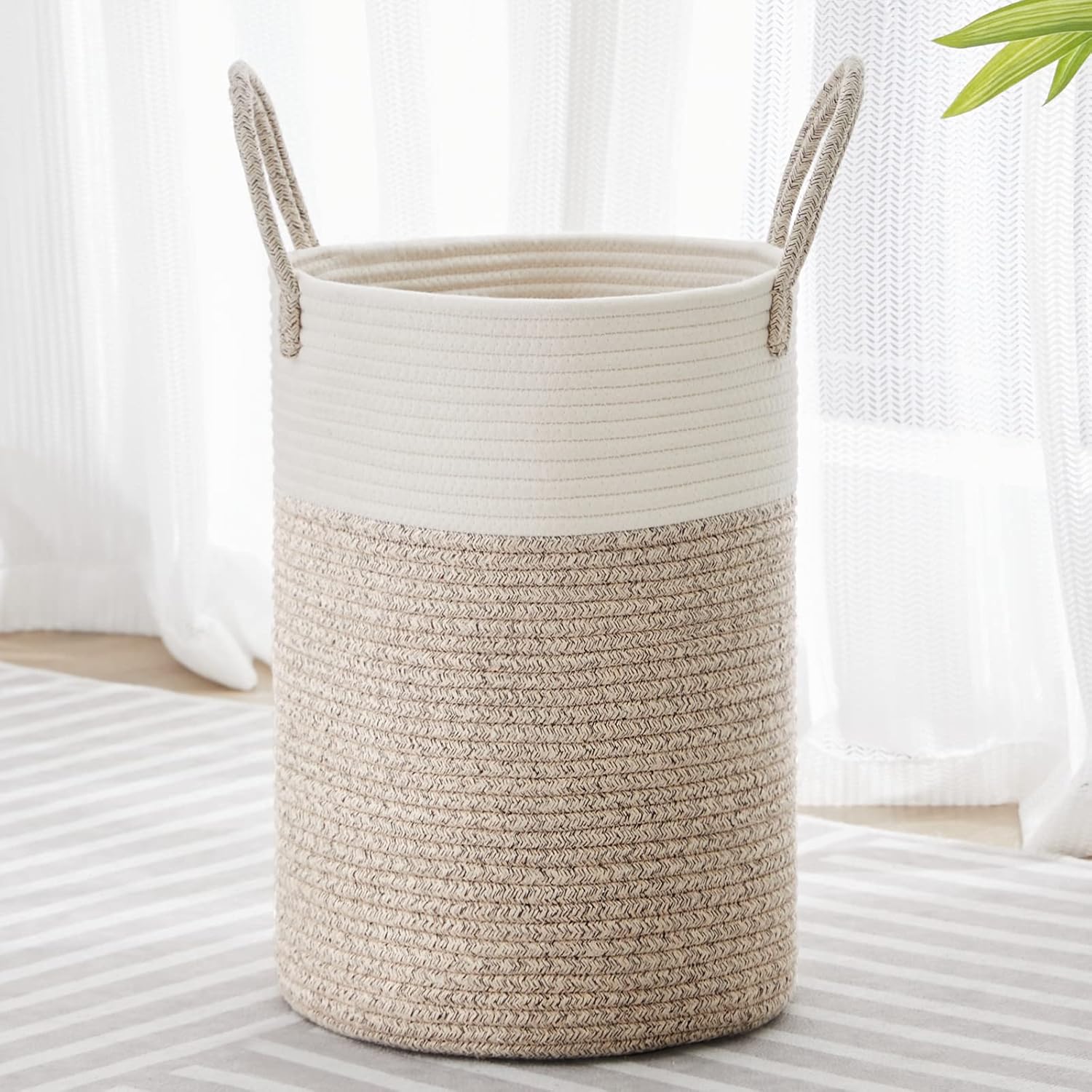 VIPOSCO Tall Laundry Hamper, Woven Rope Storage Basket for Blanket, Toys, Dirty Clothes in Living Room, Bathroom, Bedroom - 30L White & Brown