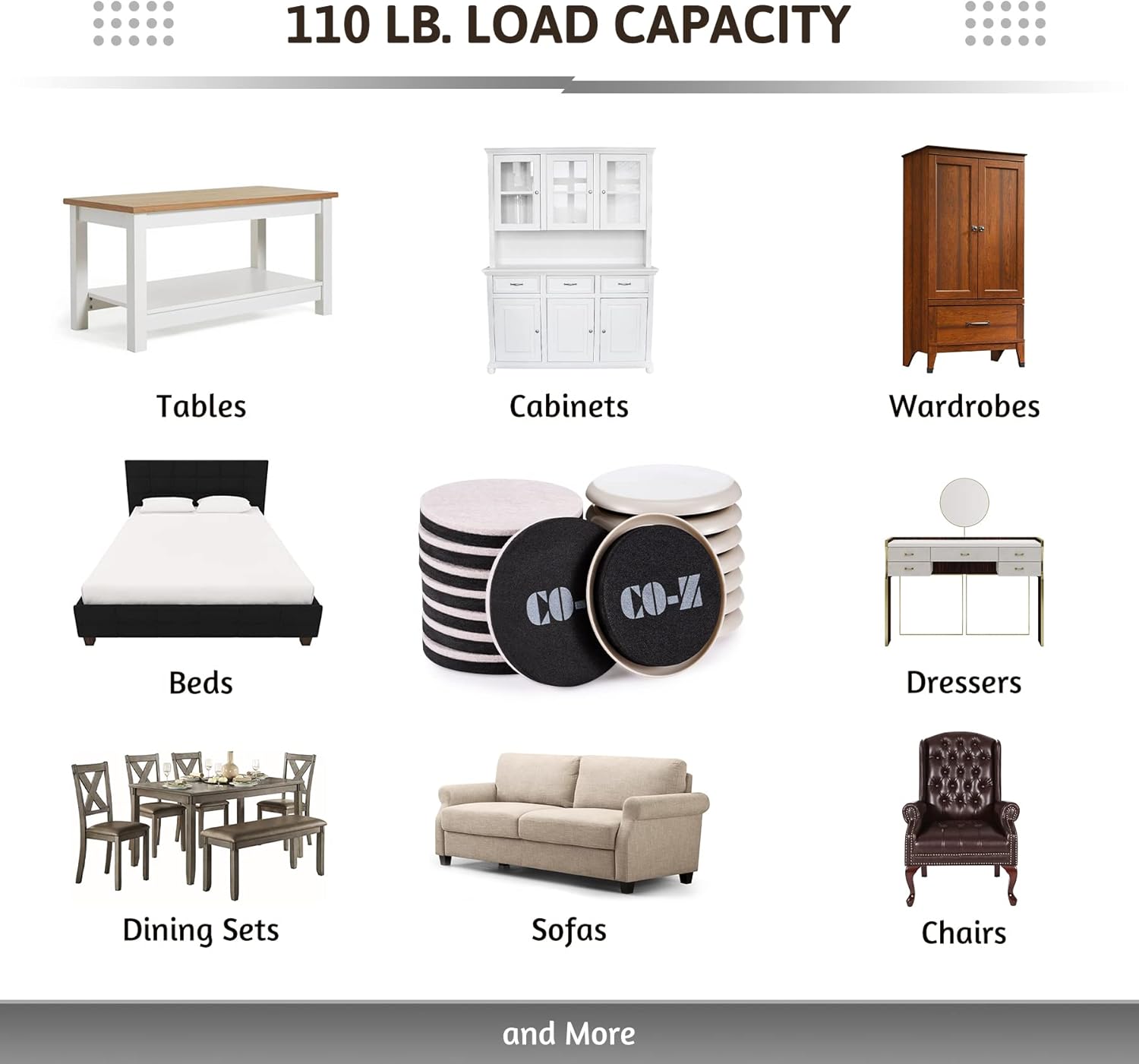 - 16-Piece Moving Kit: This CO-Z round furniture slider kit supports up to 110 lb., making it easy to move large heavy furniture across hardwood floors or carpet. With a 3.5" diameter, it's perfect for chairs, beds, cabinets, and other furniture legs