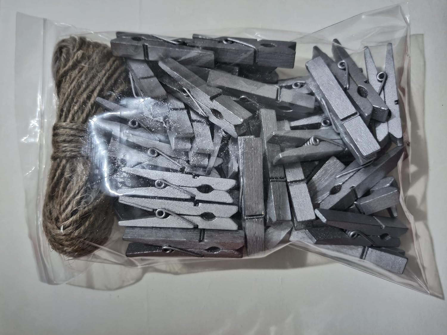 - Clothespins Set: 50 pcs silver wooden clothespins with 10 meters(33feet) natural jute twine to hang pictures or gift Decor