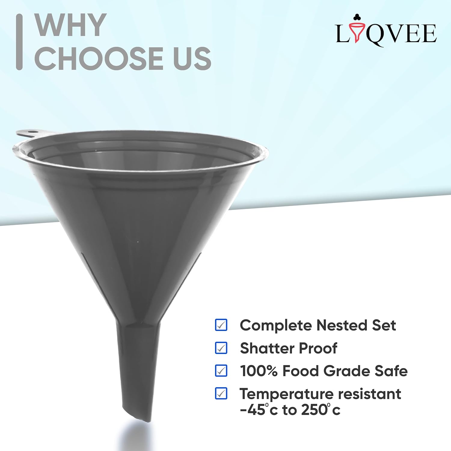 - 4 Funnels in One: Our plastic funnel set comes in a pack of different sizes to fit various applications. The extra-large funnel measures 120mm, the large one is 100mm, the medium 75mm, and the small funnel is 50mm. Each size has its specific function.