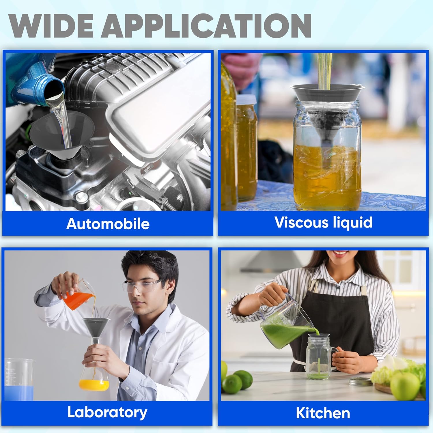 - Make Your Life Easier: Our funnel set is the perfect solution not only for transferring oil, spices, or car fuel but also for craft projects. Use the mini funnels for filling small bottles to sprinkle decorations on your art projects or for laboratory tasks at school.