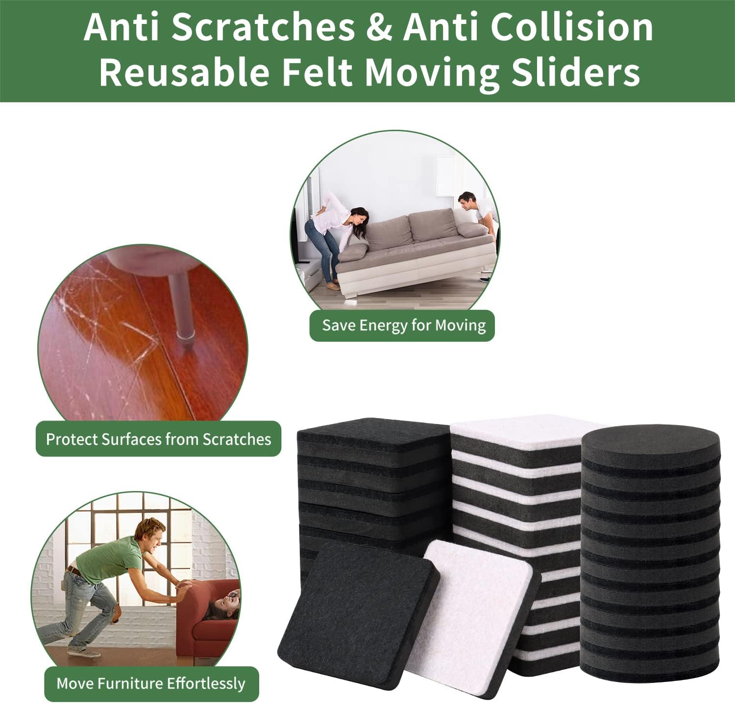 - ❤【Durable Material & Reusable】- 2.5 inch square felt furniture pads made of high-quality EVA foam and non-stick felt, these pads grip furniture securely without glue or stains. Furniture moving pads can be left in place or be removed and reused.