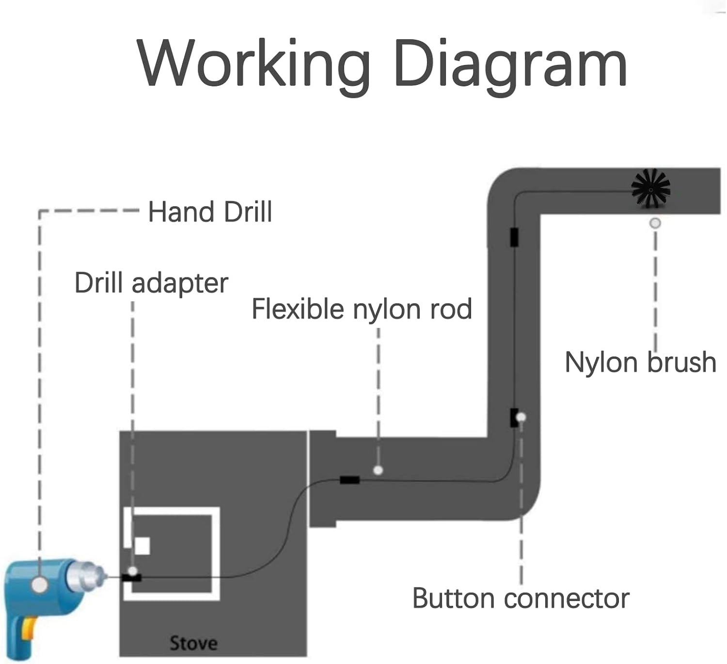 - EASY TO ASSEMBLE: 1. Attach the brush head to nylon rod. 2. Link rods together to attain the pipe length required. 3. Attached the power drill with rod, then start cleaning with it. Kindly remind that while cleaning around corners and turns or stubborn lint trap, slow down and then accelerate slowly.