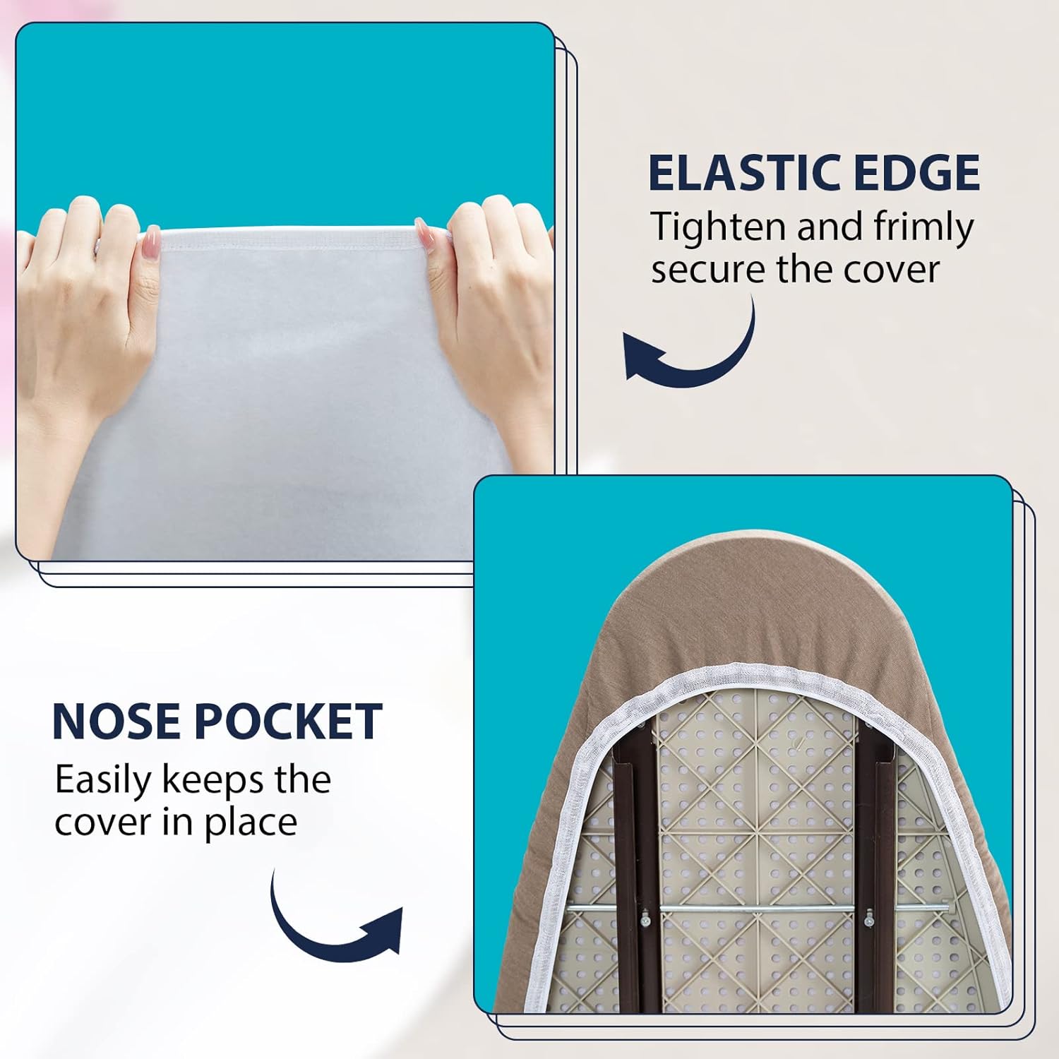 - SECURE ON YOUR IRONING BOARD TIGHTLY: The unique double non slip nose bag simplifies installation and secures it firmly in place. The adjustable rope can tighten and straighten the ironing board cover to ensure that it is not easy to move or slide