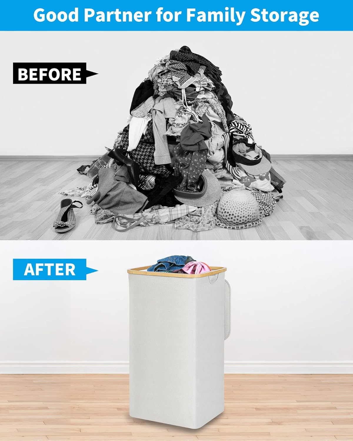 - 【Easy to Install & Fold】Thanks to the simple and compact design of the hamper. You can quickly assemble this large laundry basket in just 3 minutes without tools.You can easily collapse it when not in use.