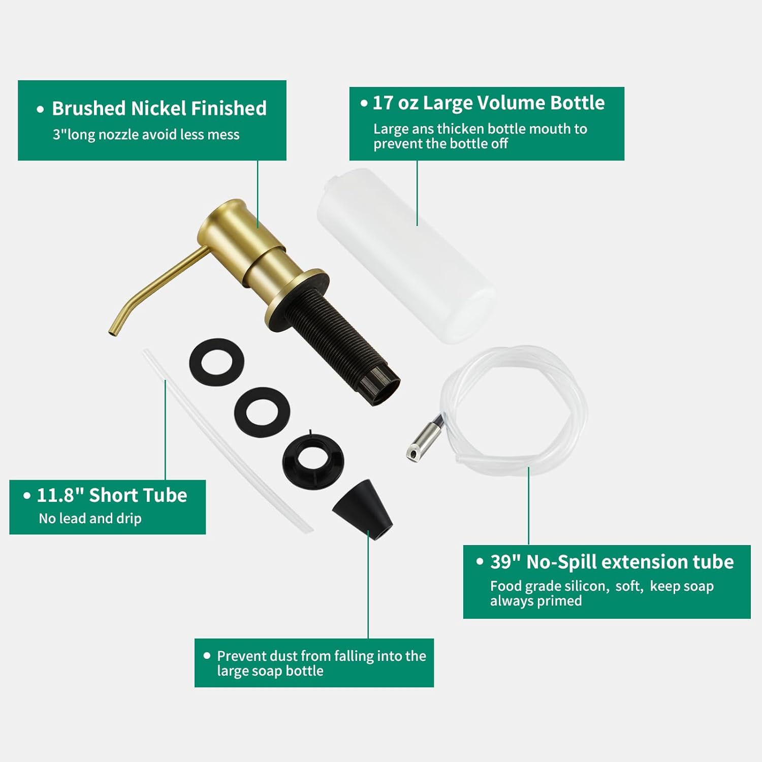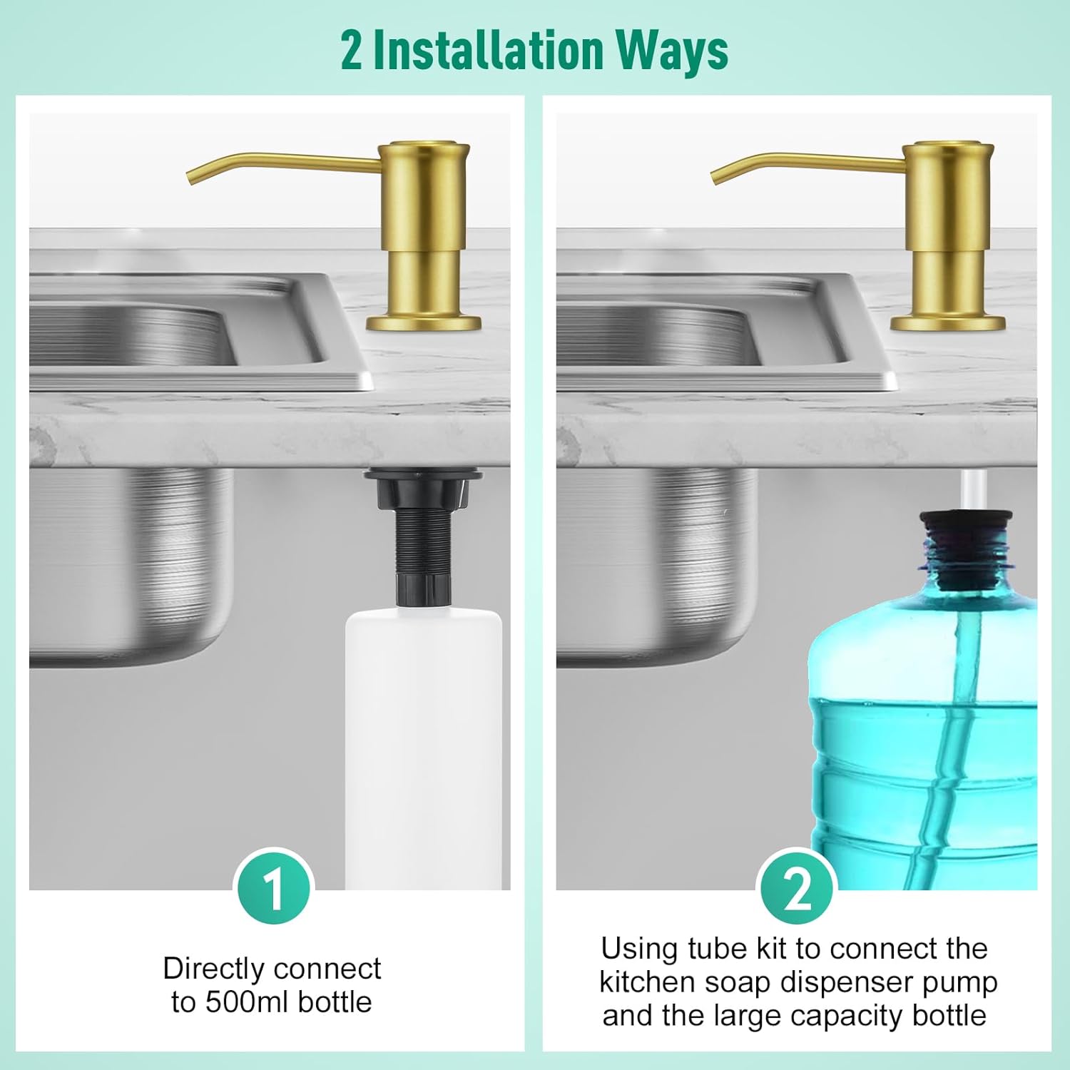 - 💧【FAST AND EASY INSTALLATION】 The kitchen soap dispenser comes with detailed instructions. You can install this kitchen sink soap dispenser on the sink or countertop in a few minutes. Even for lay people, just connect with extension tube kit,use the big bottle directly, skipping the messy for refilling.Then enjoy your new soap dispenser.