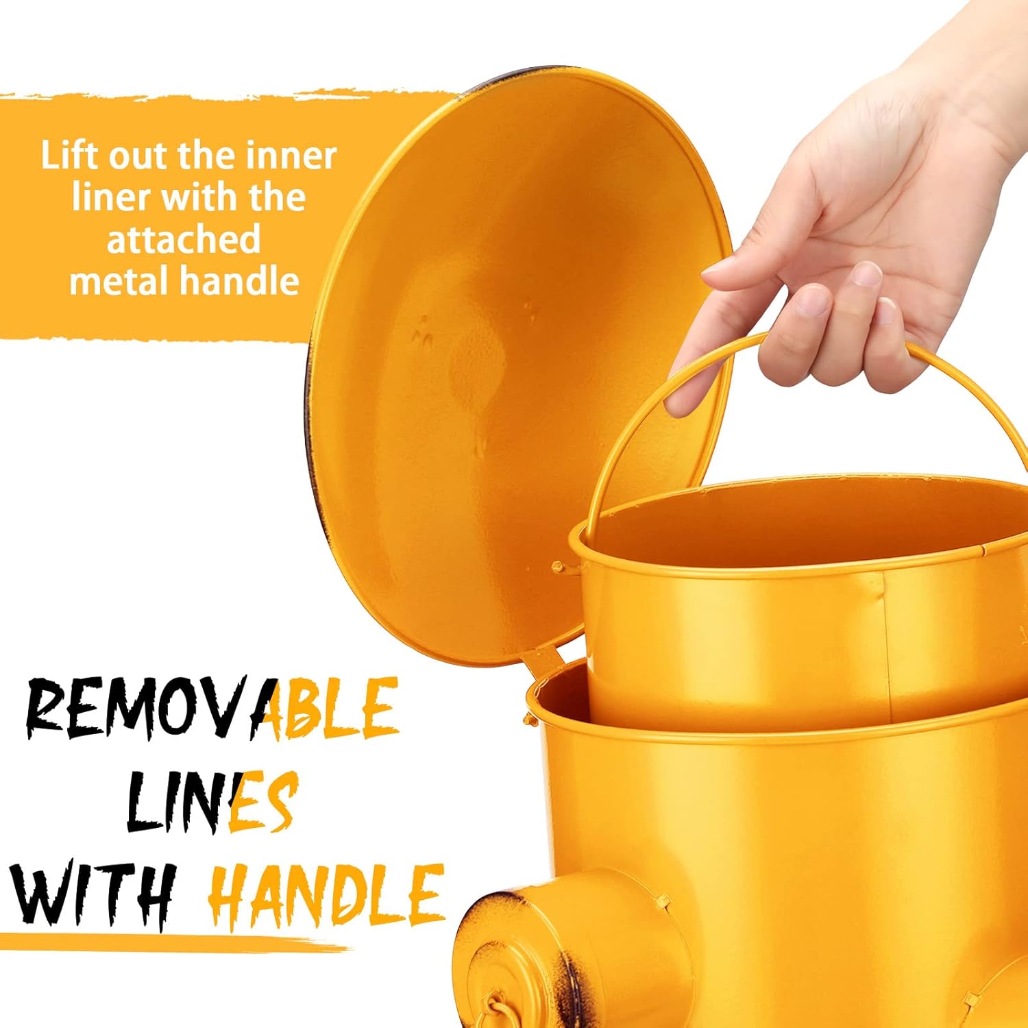 - Removable Inner Bucket: the retro metal trash can includes a removable inner bucket with handle for easy removal and emptying of trash for easy portability