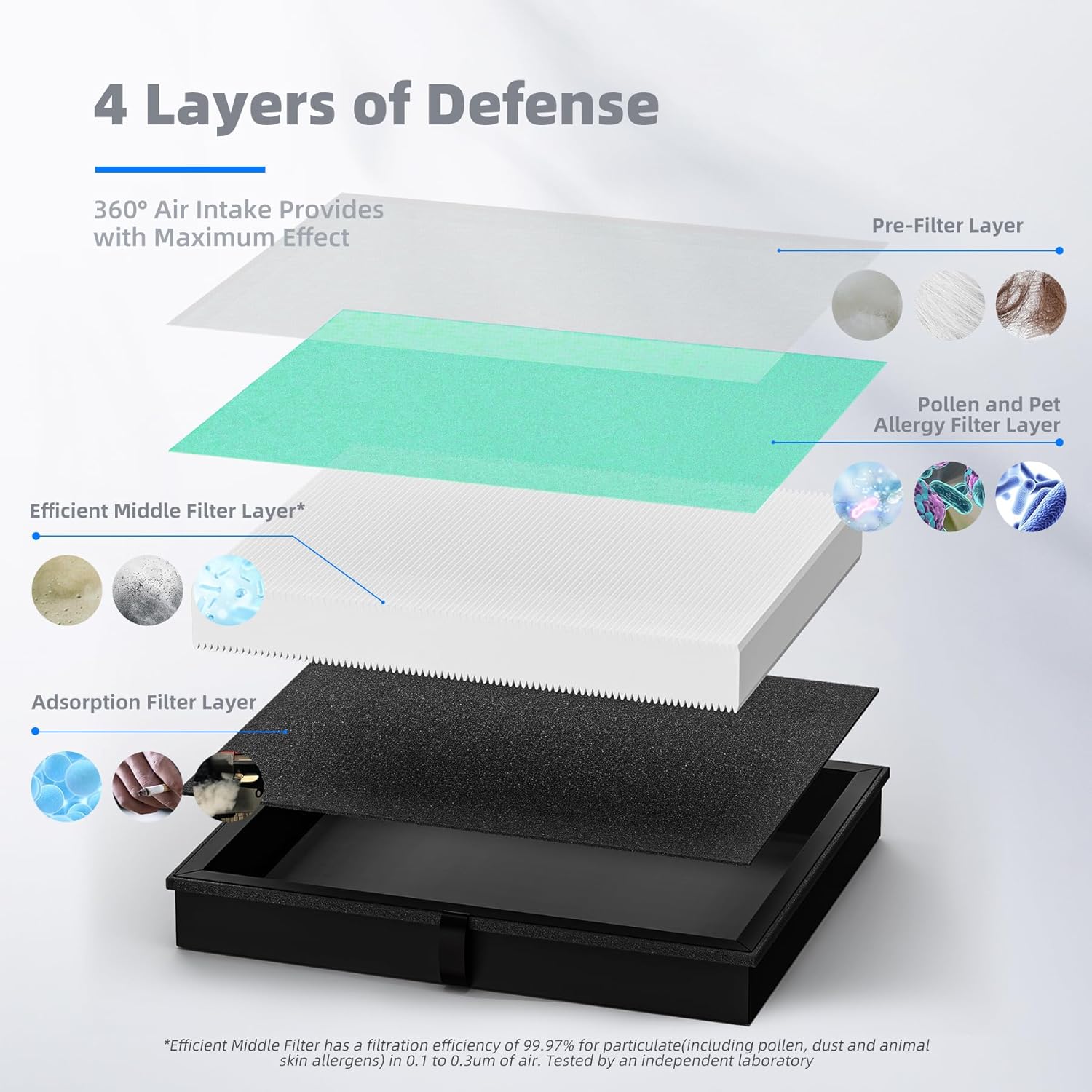 - Prevent Clogging: When hairs, dander, and other large particles meet the pre-filter layer, they will be blocked outside to prevent the air purifier from clogging.