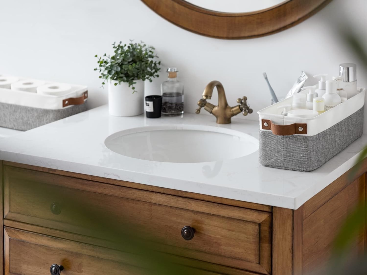 - The sleek modern design with 2 widened sewn-in handles makes this small basket a great addition to any home.