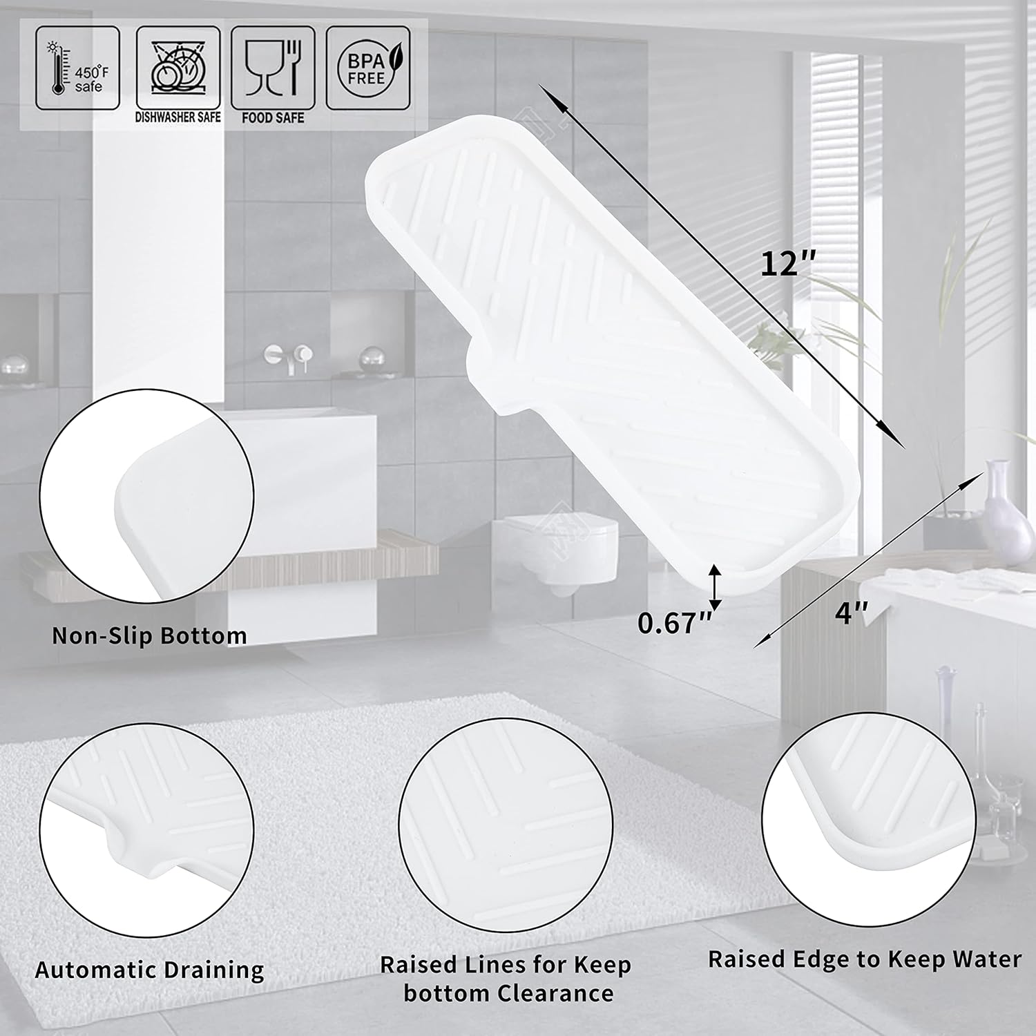Silicone Bathroom Soap Dishes with Drain Spout-Bathroom and Kitchen Sink Organizer,Sponge Holder,Dish Soap Tray,Perfect for Dispenser,Scrubber,Bottle,Cup on Sink or Counter-White 12"×4"