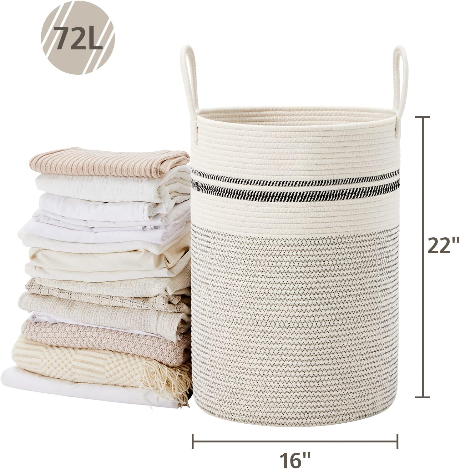 VIPOSCO Large Laundry Hamper, Tall Woven Rope Storage Basket for Blanket, Toys, Dirty Clothes in Living Room, Bathroom, Bedroom - 72L Stripe White