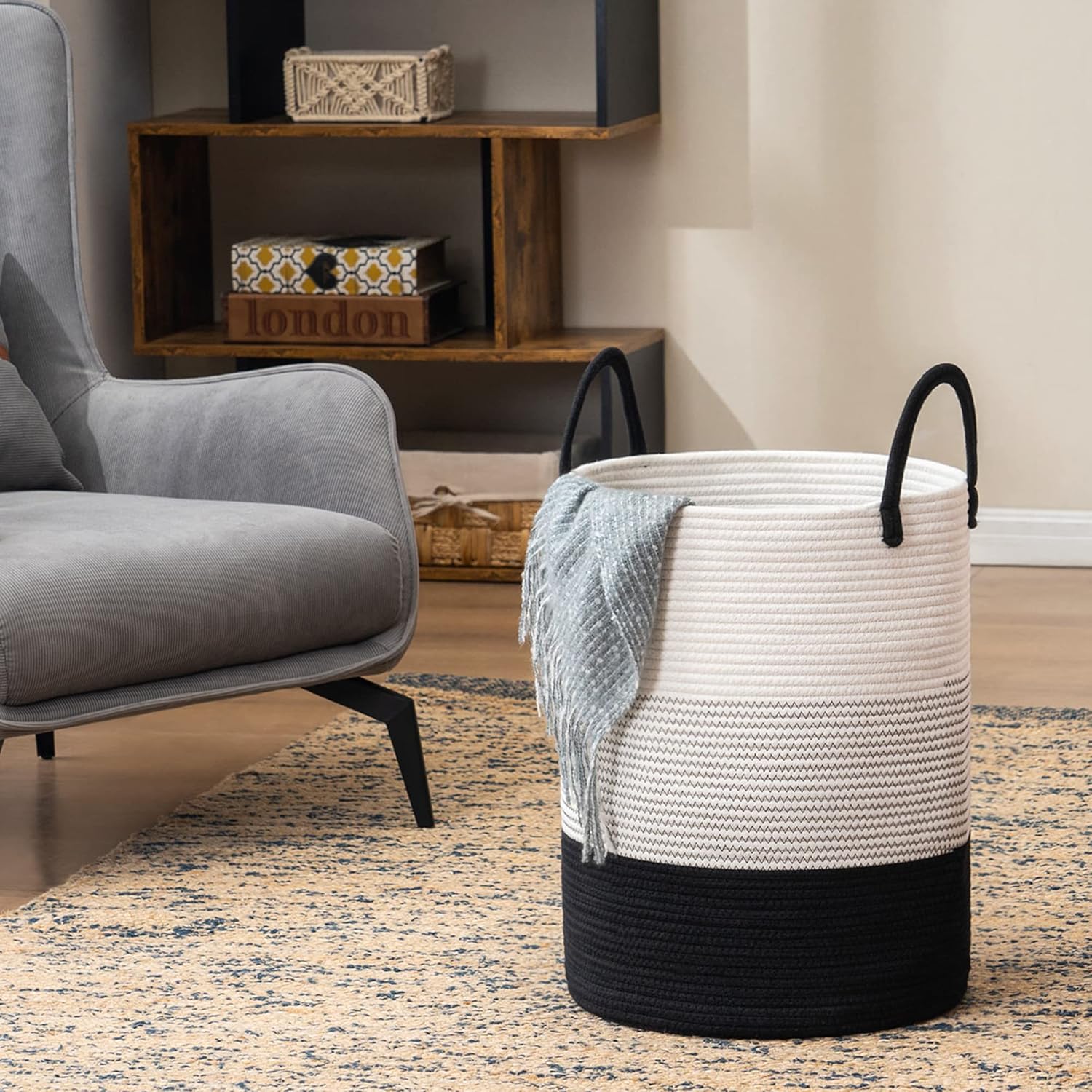 YOUDENOVA Woven Rope Laundry Hamper Basket, 72L Tall Laundry Basket, Baby Nursery Hamper for Blanket Storage in Bedroom-Large-Dark White