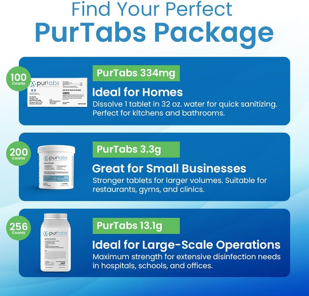- Available in Multiple Sizes: Choose from 334mg (100 count) for everyday home use, 3.3g (200 count) for small businesses, or 13.1g (256 count) tablets for large-scale operations to suit your disinfection needs