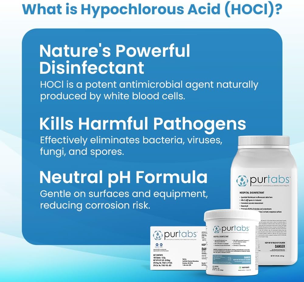- Hypochlorous Acid Power: Dissolving into hypochlorous acid (HOCl), a natural antimicrobial agent, PurTabs offer effective cleaning and disinfection without harsh chemicals, suitable for everyday use