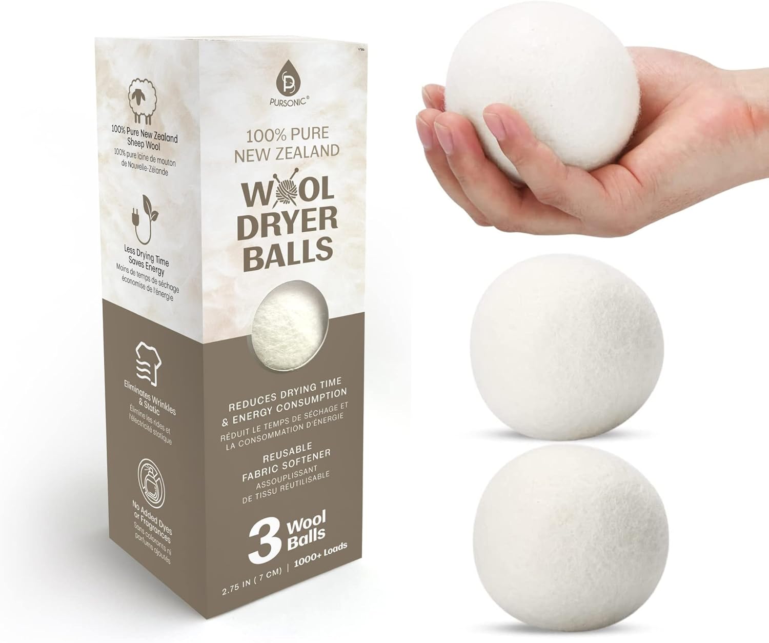 Pursonic Laundry Wool Dryer Balls – Reusable Dryer Balls Made from 100% Pure New Zealand Wool – Natural Fabric Softener Balls - Saves Drying Time/Energy Consumption (Pack of 3)